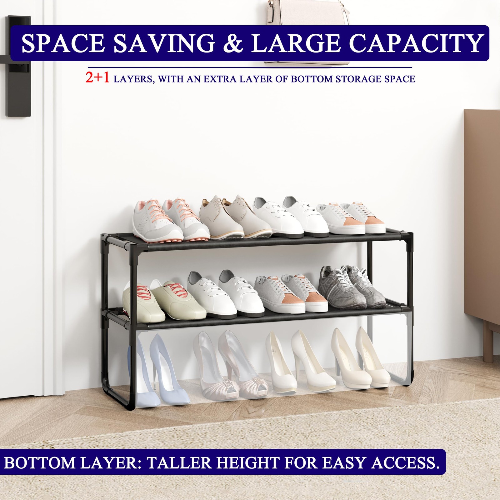 Long Shoe Rack, 2-Tier Stackable Shoe Organizer for Closet, Entryway, Hallway, E