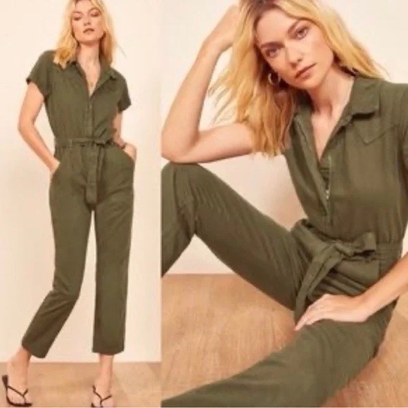 Reformation Cassidy Denim Jumpsuit Army Green Olive Short Sleeve Belt Size 12 L