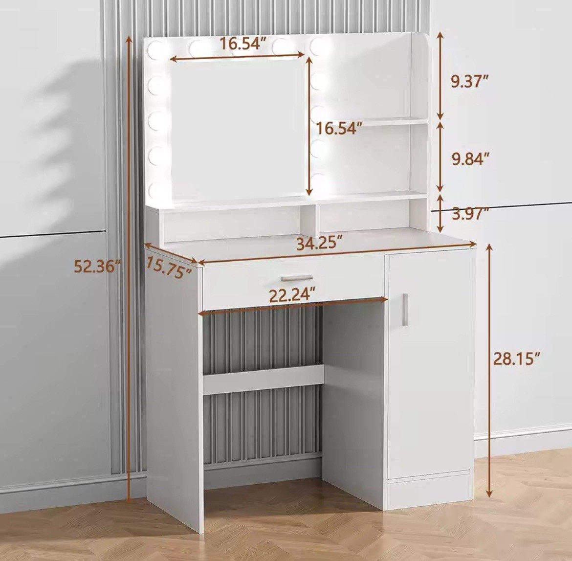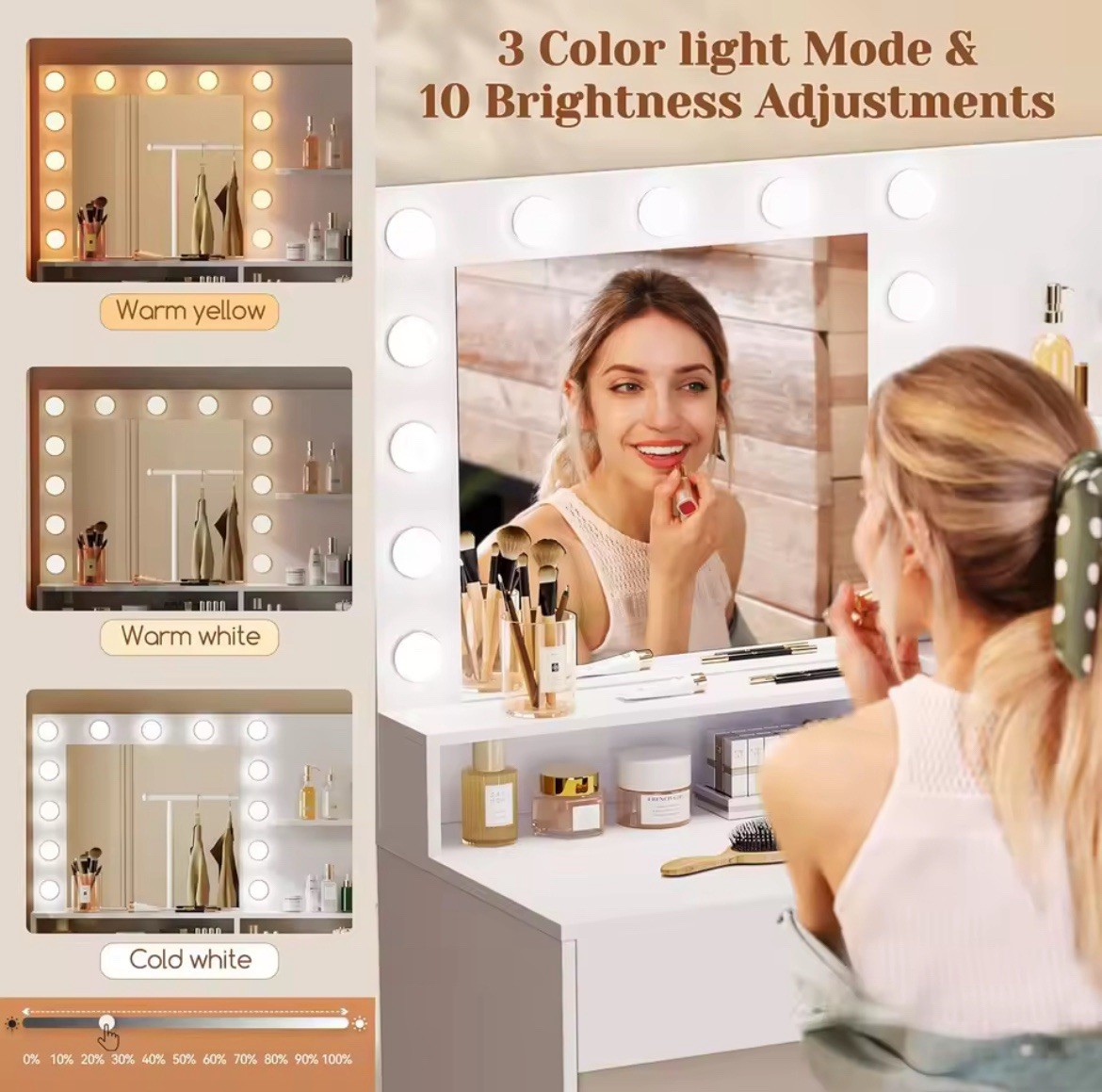 White Vanity Desk Adjustable LED Lights With Mirror, Makeup Dressing Table