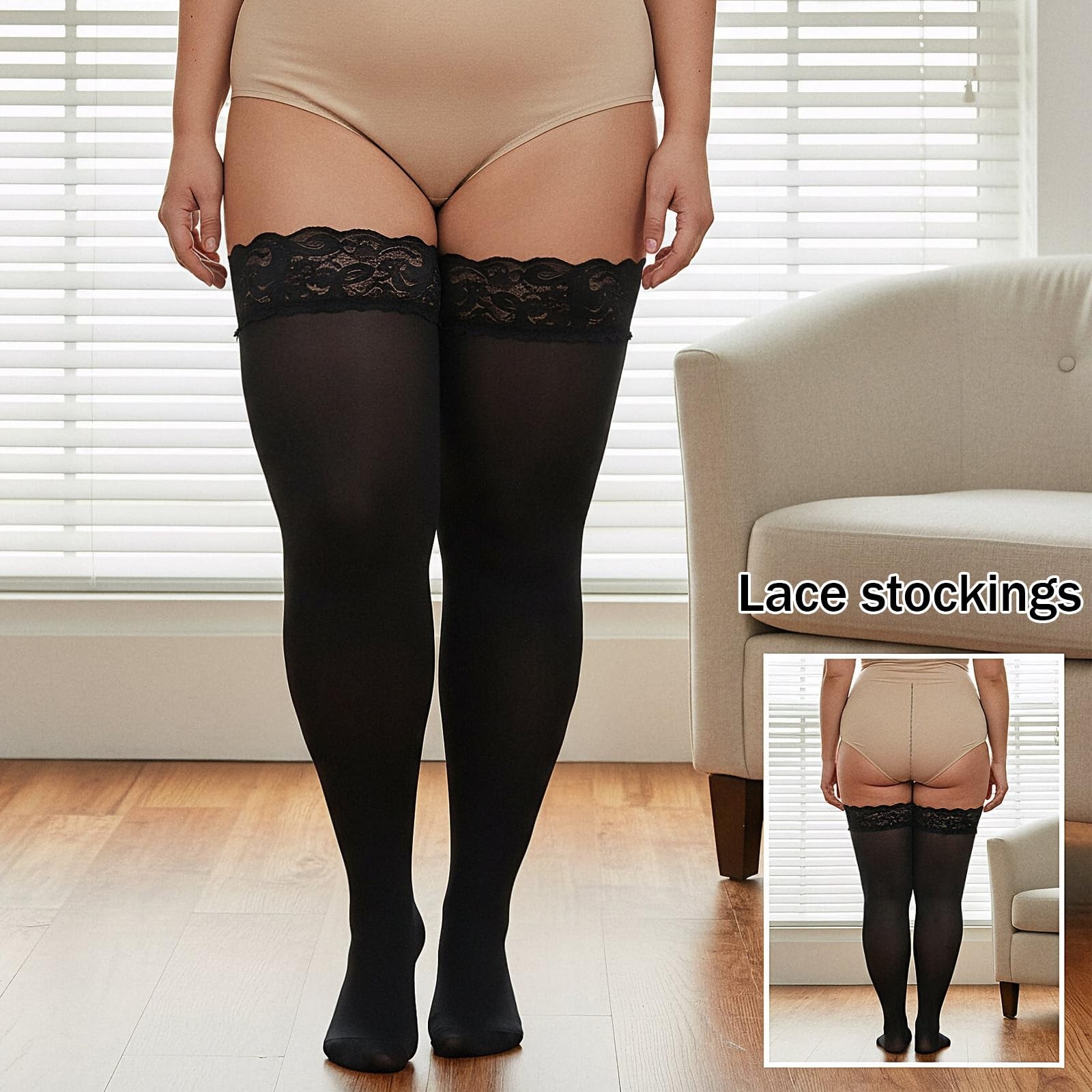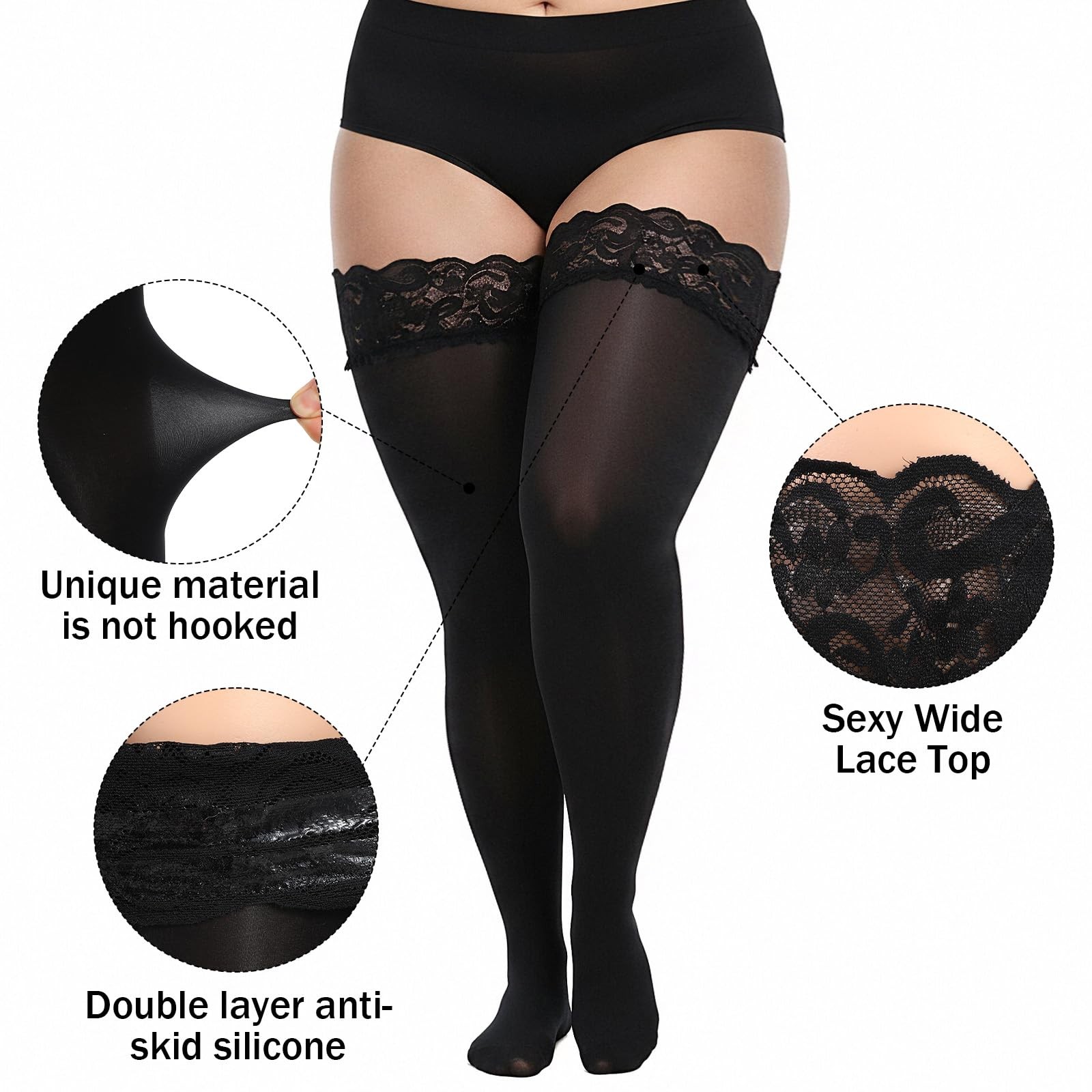 Prasacco Plus Size Thigh High Stockings, Women Sheer Lace Small-Large, Black