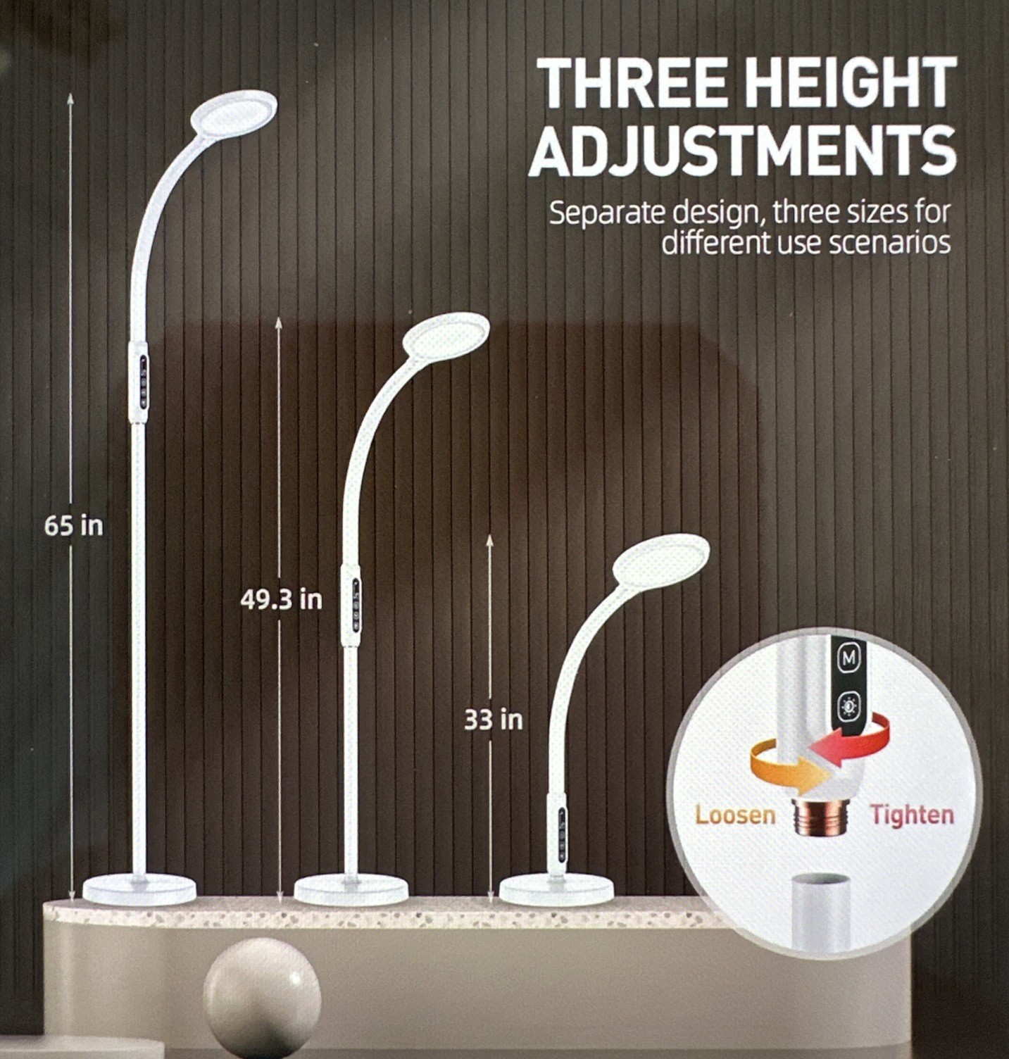 Особенности: 11,000 lux brightness, UV-free full spectrum light, 10 adjustable brightness levels, 5 step Color Teperature design, Floor or Table, 360° Adjustable Gooseneck, Timer, Touch Panel, Remote, Presets, 12W