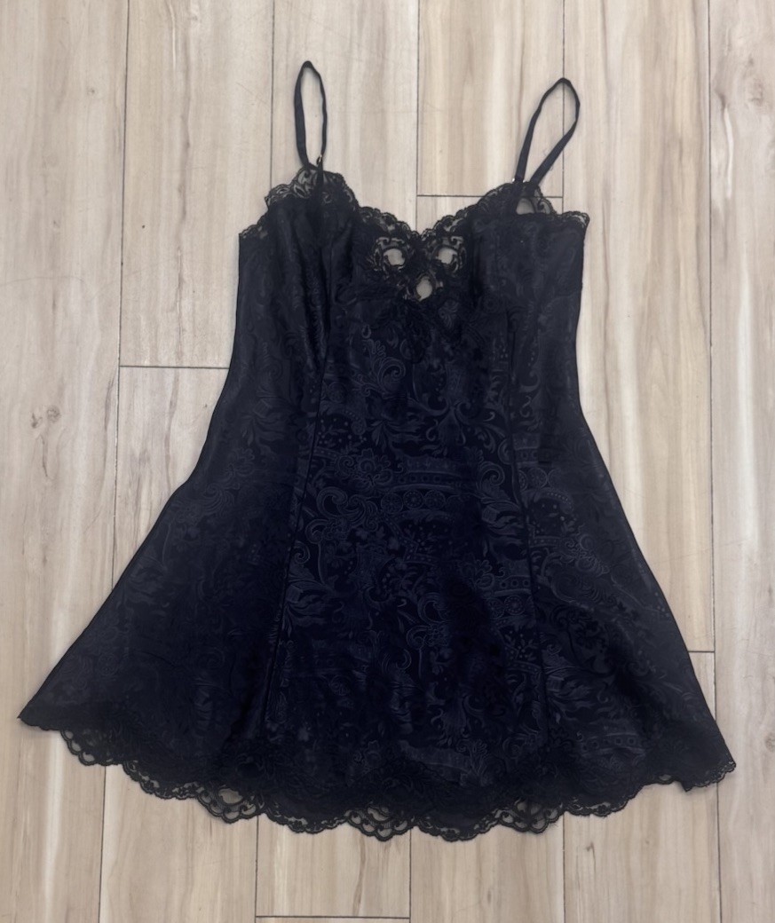 VTG 1991 Victoria Secret Gold Label Med. Black Chemise Slip Dress Nightie Lace