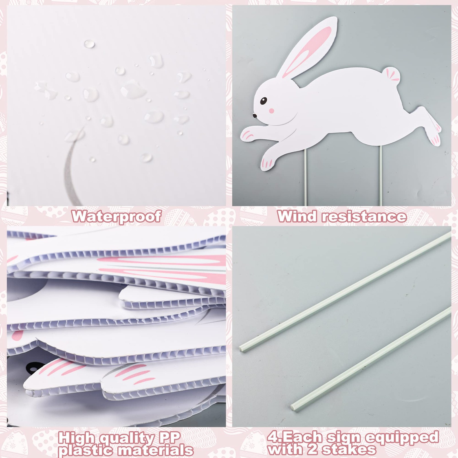 Included Components: 9 Easter Bunny Yard Signs, 18 Stakes