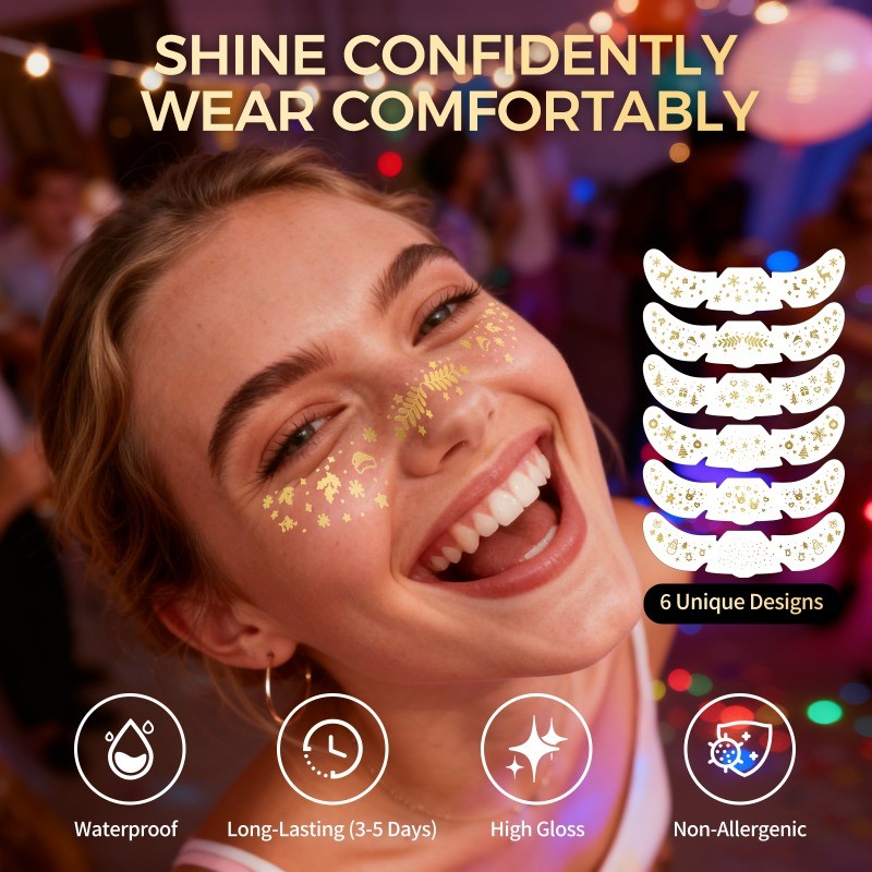 Temporary Facial Tattoo Stickers 6 Glitter Designs Festivals Parties Holidays