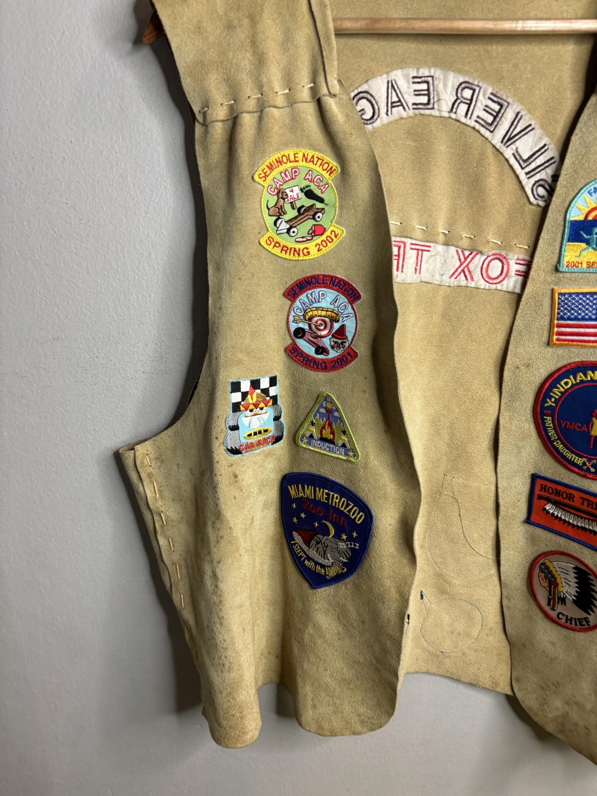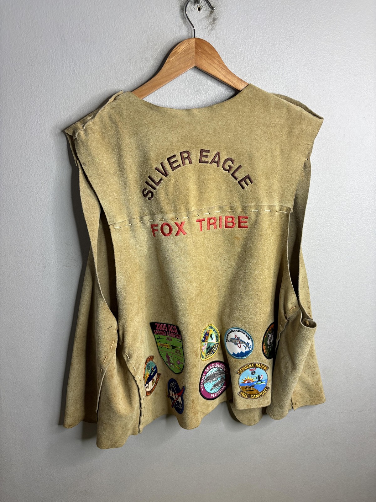 VTG Indian Princess Suede Vest Boy Scout One Size Beige Camping Patch Fox Tribe