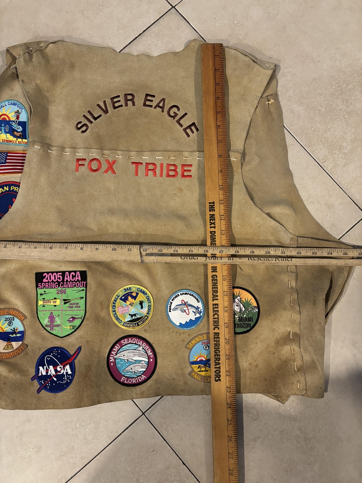как выглядит VTG Indian Princess Suede Vest Boy Scout One Size Beige Camping Patch Fox Tribe фото