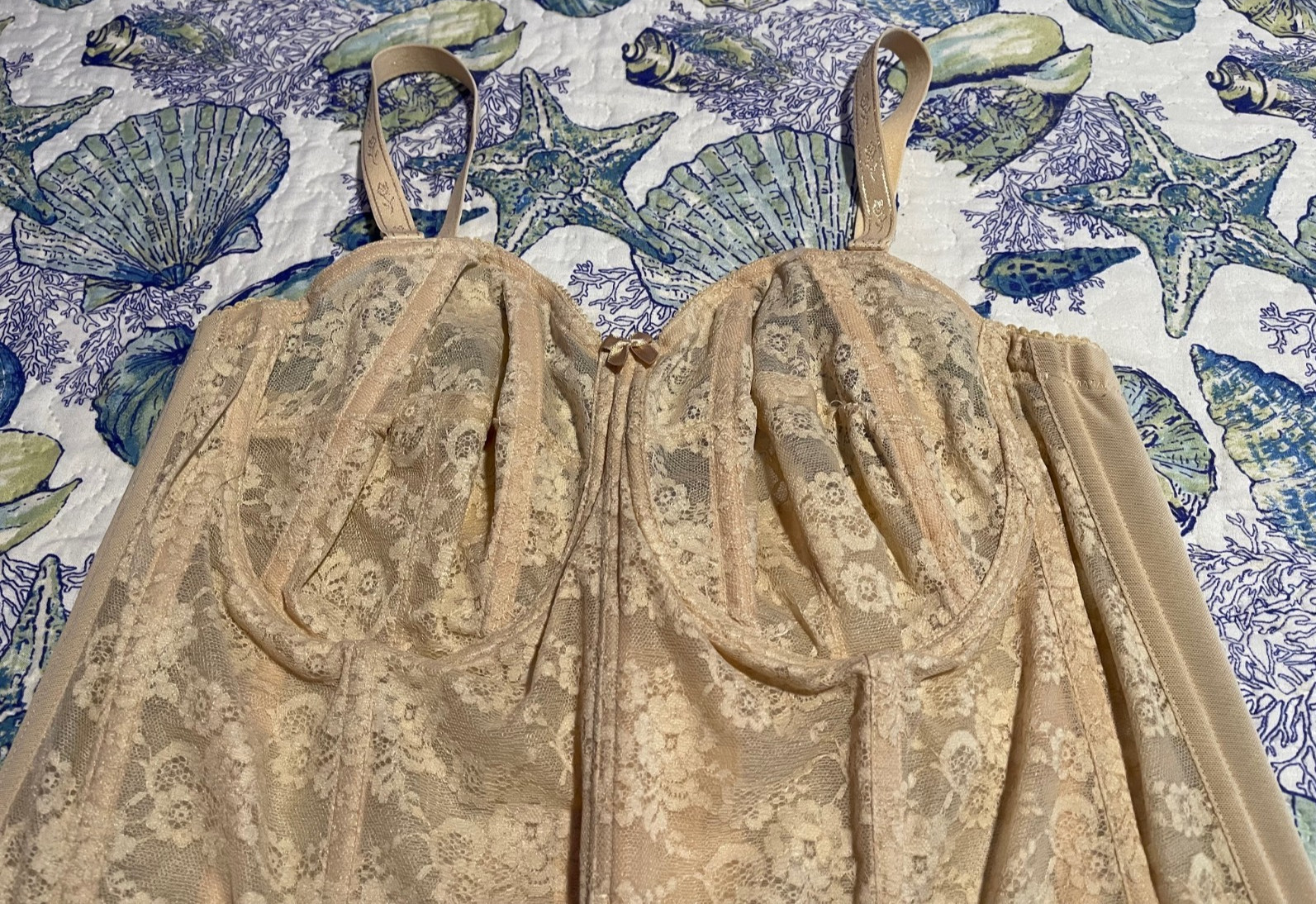 как выглядит VTG ELILA LONG LINE LACEY CORSET BUSTIER SHAPER UNDERWIRE BRA 6621 SZ 42D BEIGE фото