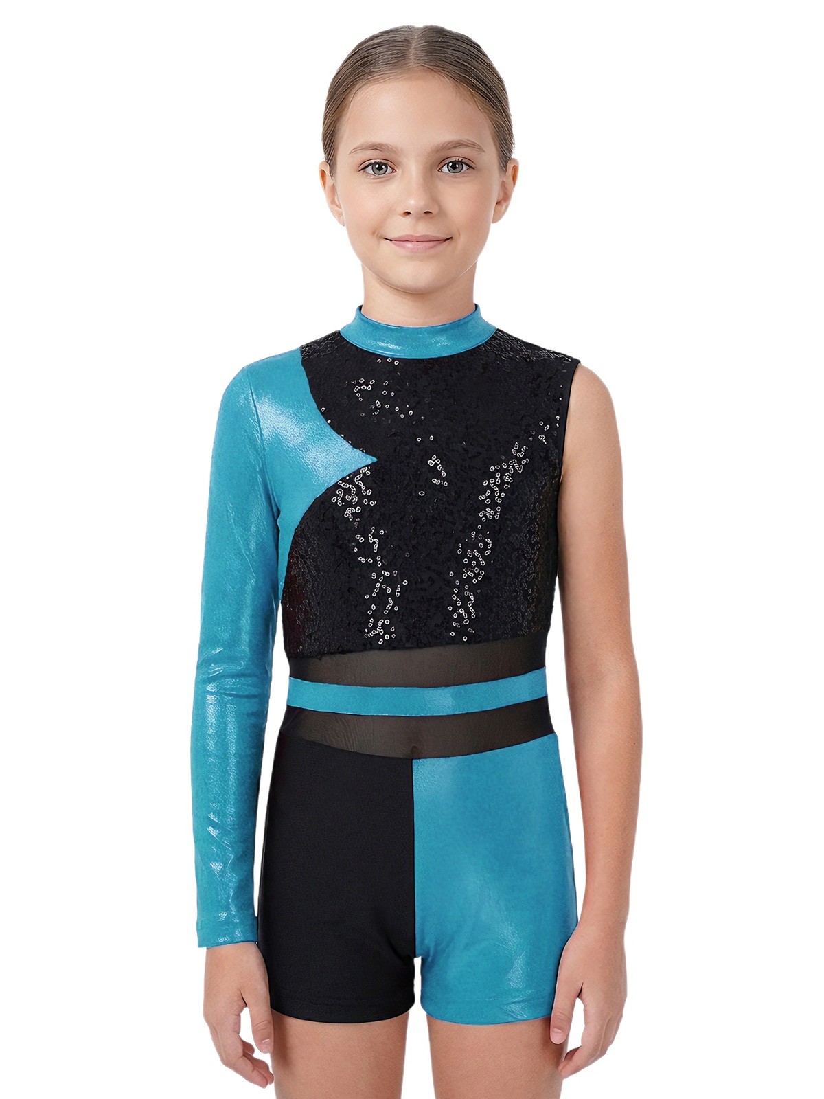 Kids Girls Leotard Cutout Dancewear Shiny Jumpsuit Outfit Asymmetrical Costume