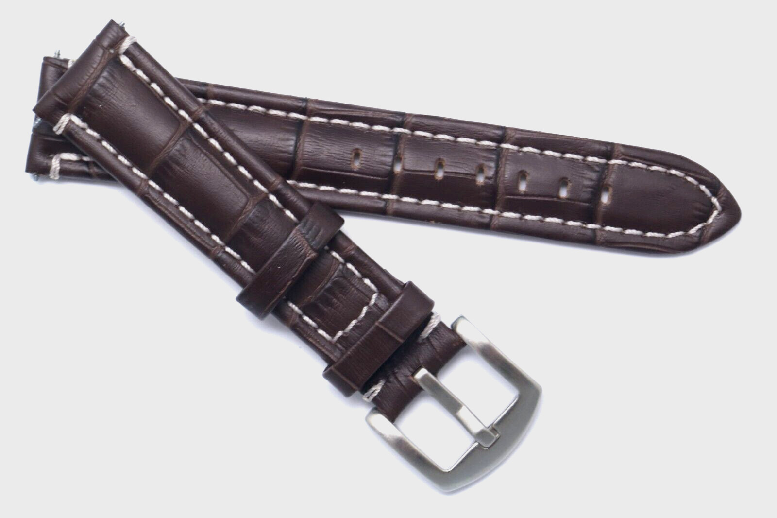 3Pcs 20mm Brown Croco Embossed Leather Contrast Stitch Watch Band Silver Buckle