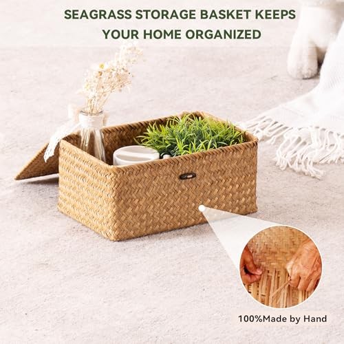 Storage Basket with Lid, Natural Seagrass Bin with Lid Set of 3, NATURAL01