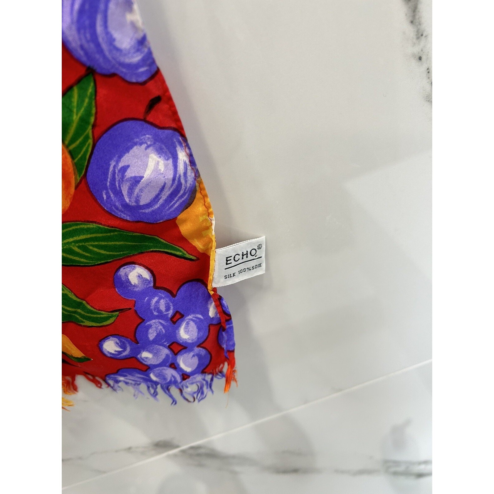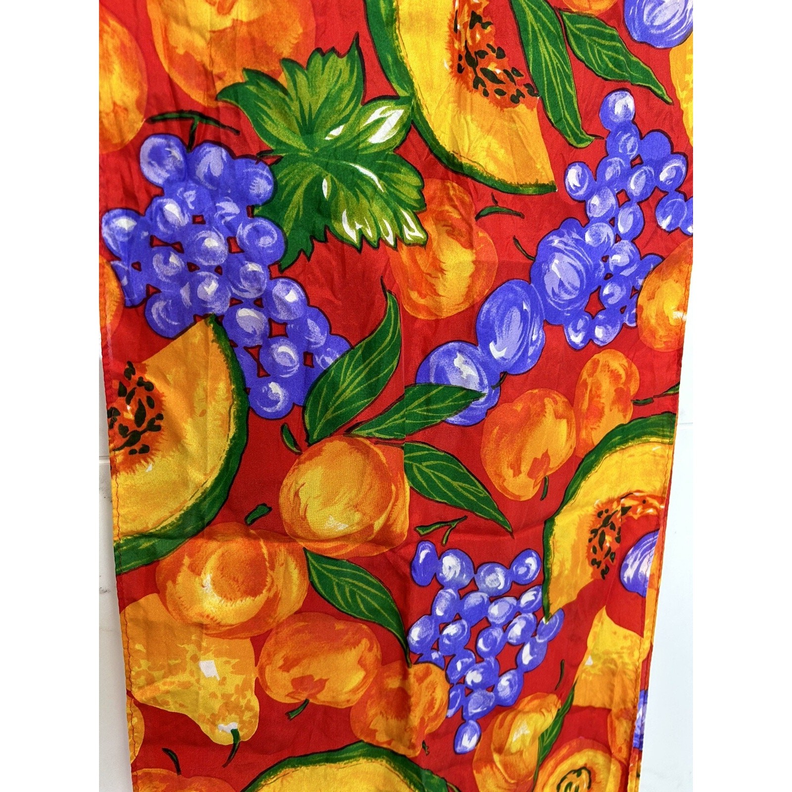 как выглядит Vintage ECHO Silk Bright Colorful Fruit Print Scarf Long Rare 80 X11 Resort фото