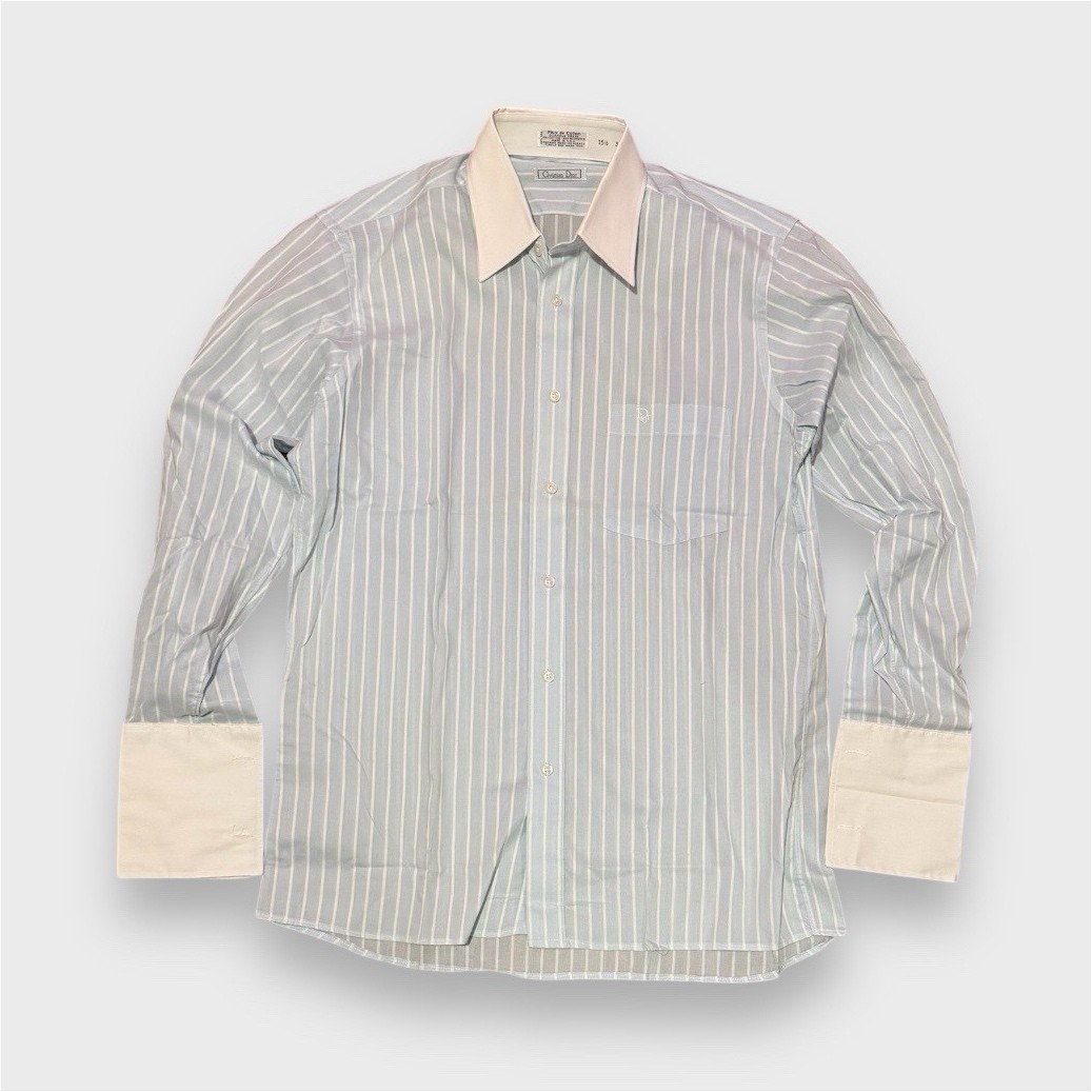 Christian Dior Men's Striped Dress Shirt Light Blue White Point Collar Vintage