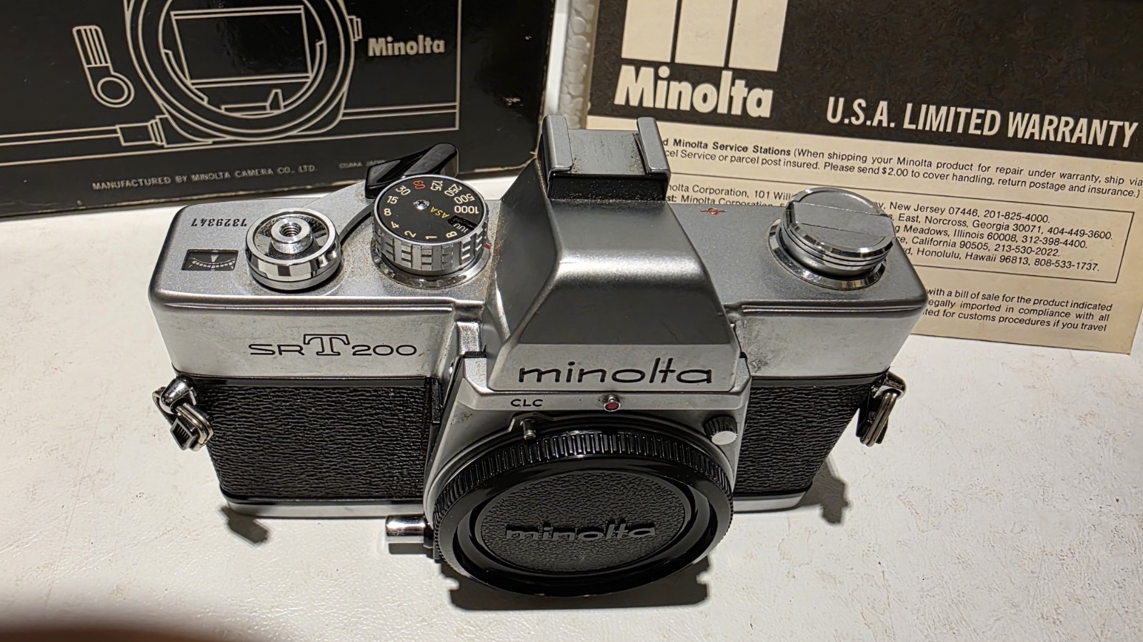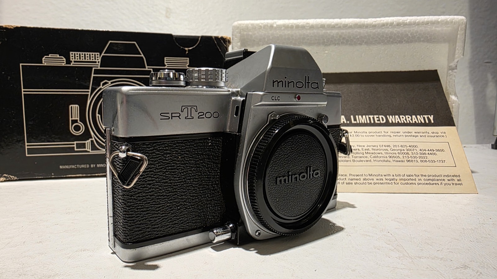 Minolta SRT201 35mm SLR Film Camera Body with Body Cap in Original Box silver
