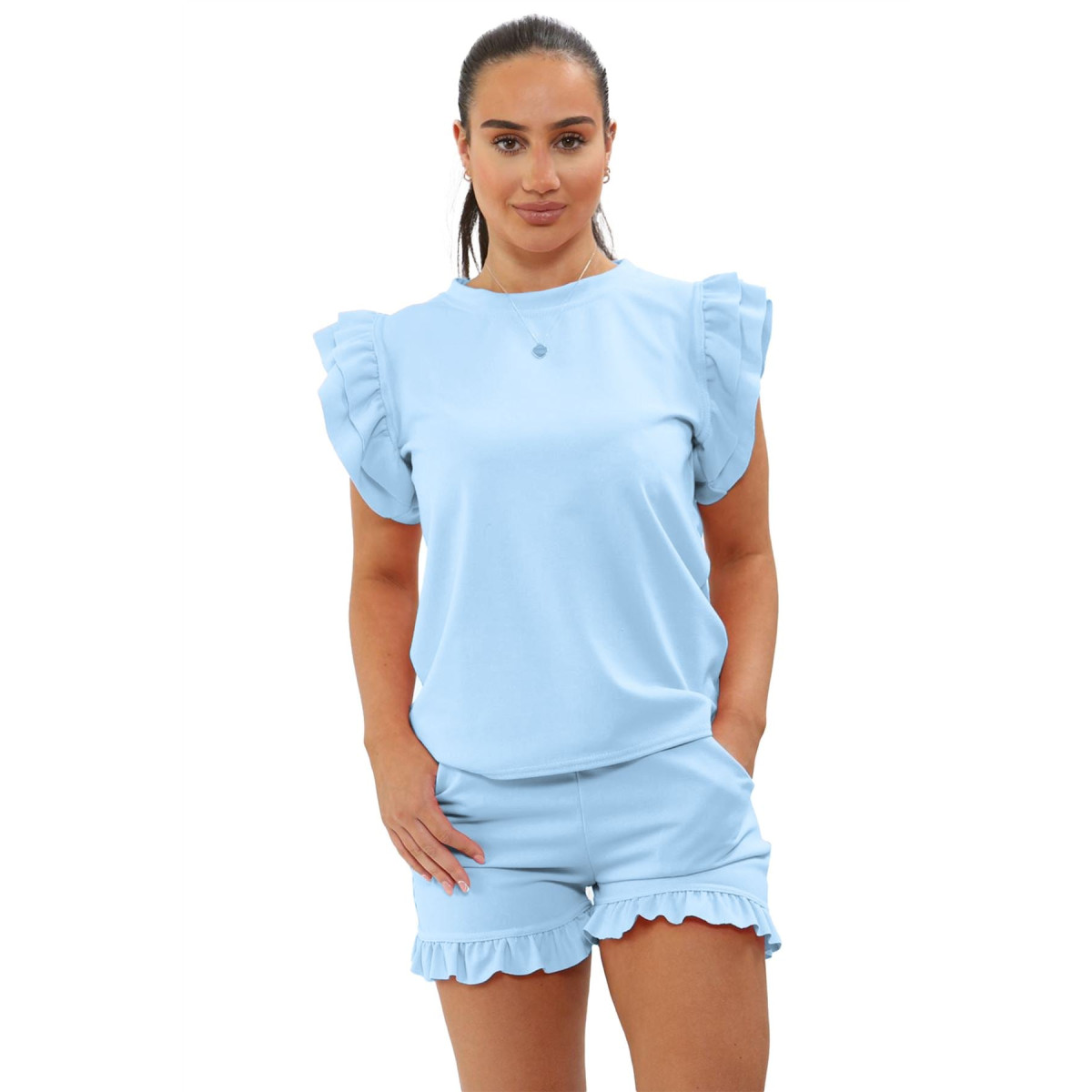 как выглядит Tracksuit Sky Blue X/L Lightweight Breathable Ladies Frill Peplum Top Shorts фото