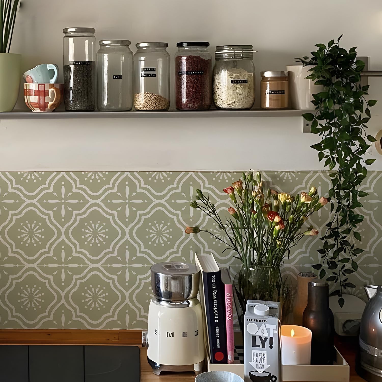 как выглядит 25Pcs Peel and Stick Tile Transfer Stickers, Sage Green Floral Tile Decal -Ad... фото