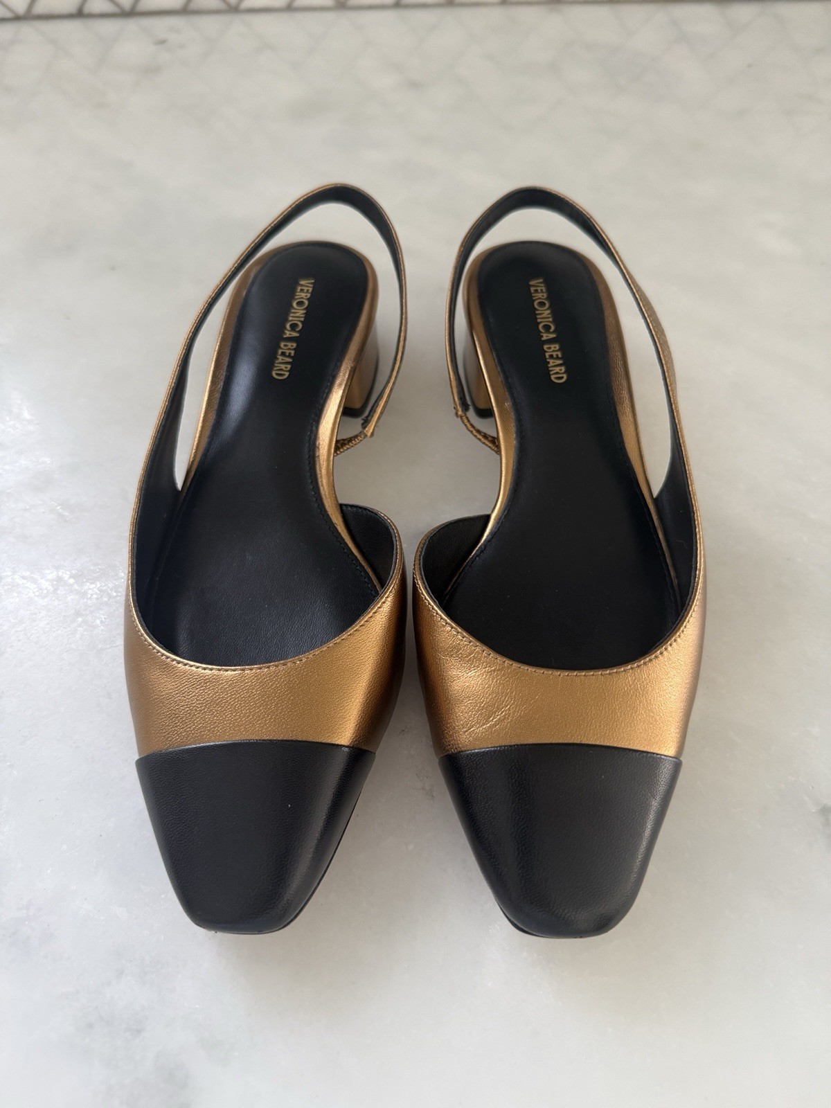 как выглядит VERONICA BEARD NWOB Bronze Black Leather Cap Toe CECILE Slingback Heels Size 6 фото
