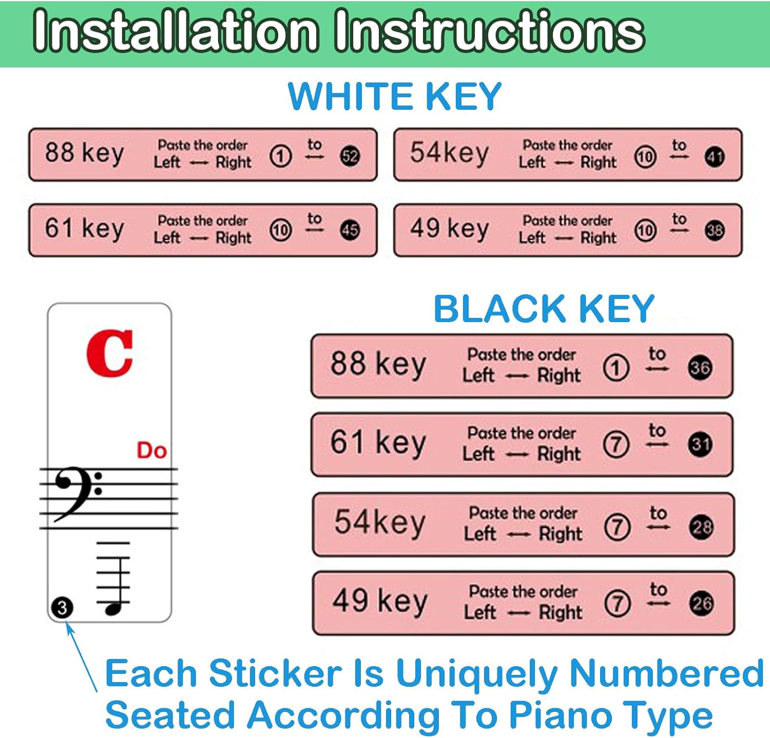 Piano Keyboard Stickers with Sheet Music for 88/61/54/49/37 Key Instruments