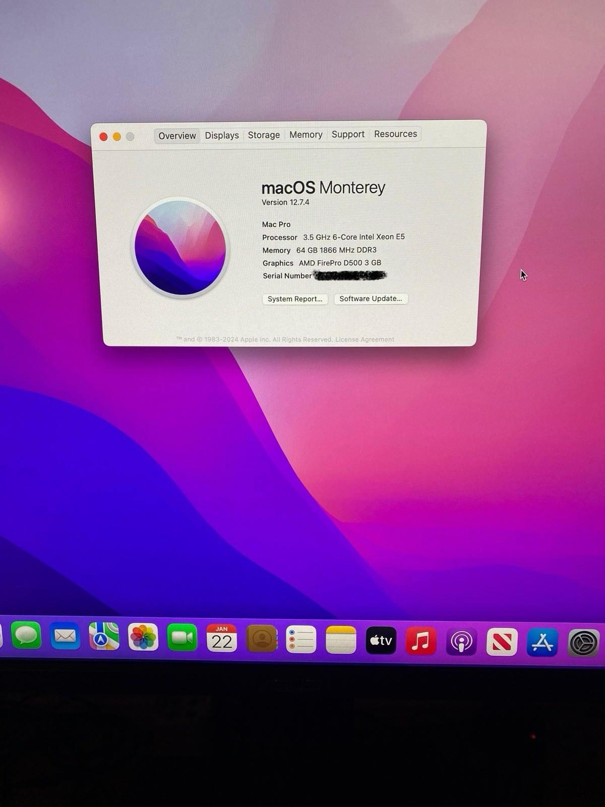 Apple Mac Pro Desktop Xeon E5 64GB RAM 251GB SSD AMD FirePro D500 macOS Monterey