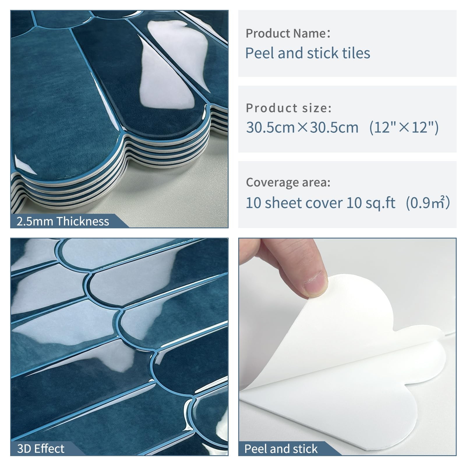 Blue Backsplash Tile Peel and Stick 12x12 for Kitchen Bathroom Self Adhesiv...