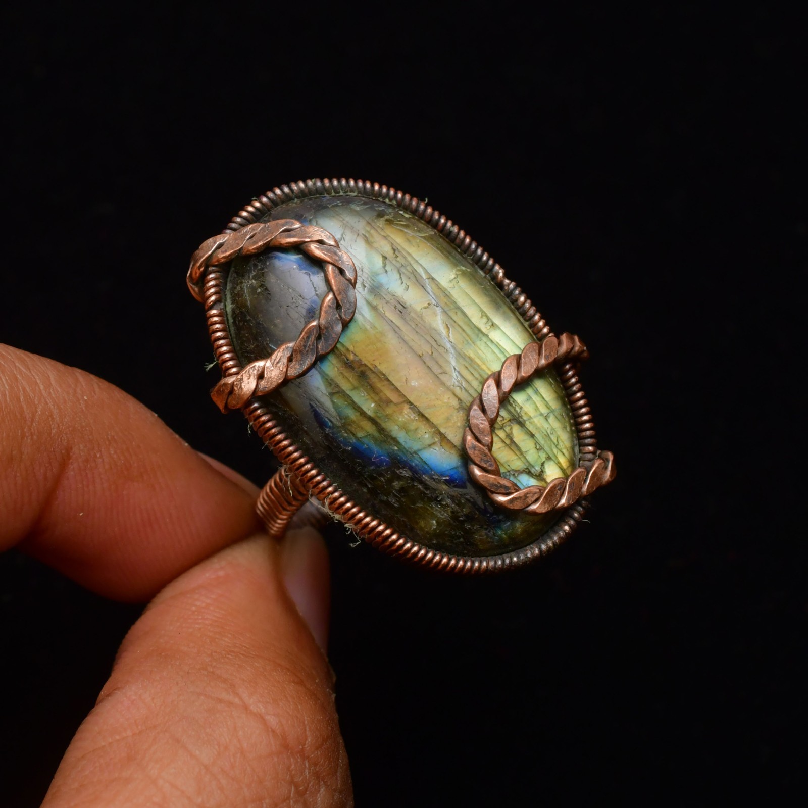 Labradorite Gemstone Copper Wire Wrapped Handmade Jewelry Ring Size 8