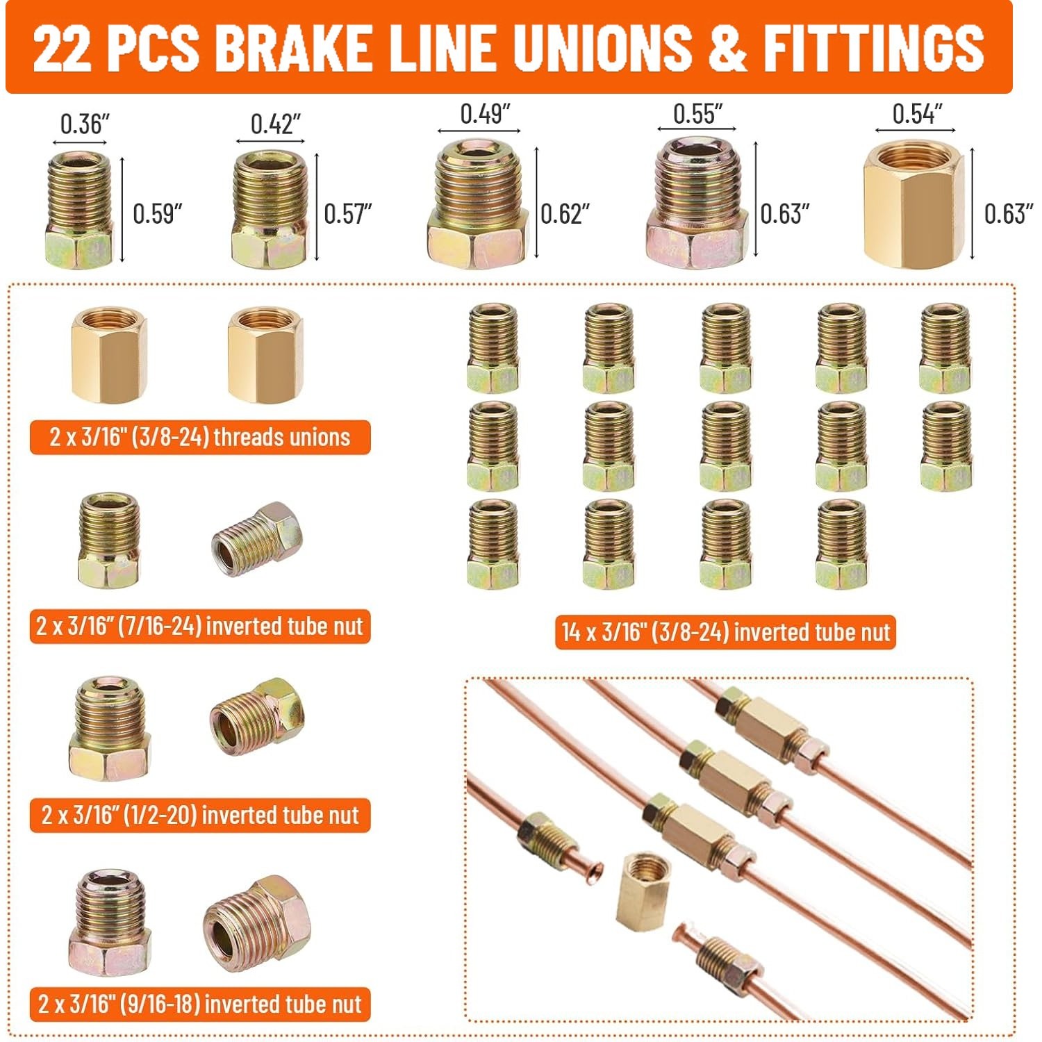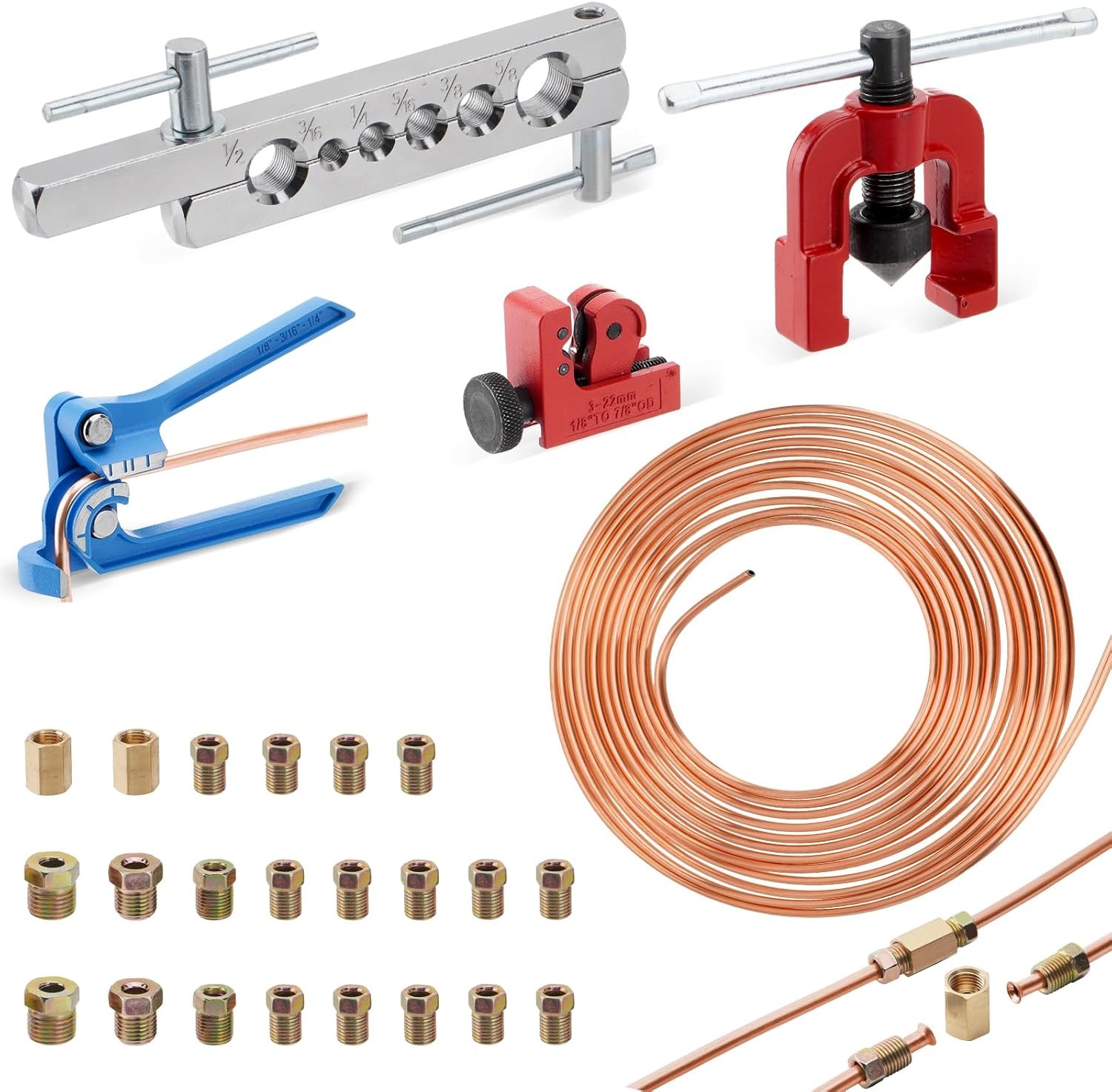 Set 25Ft 3/16 Copper-Coated Brake Line Kit With 16 Fittings, 2 Union and 4 Nut