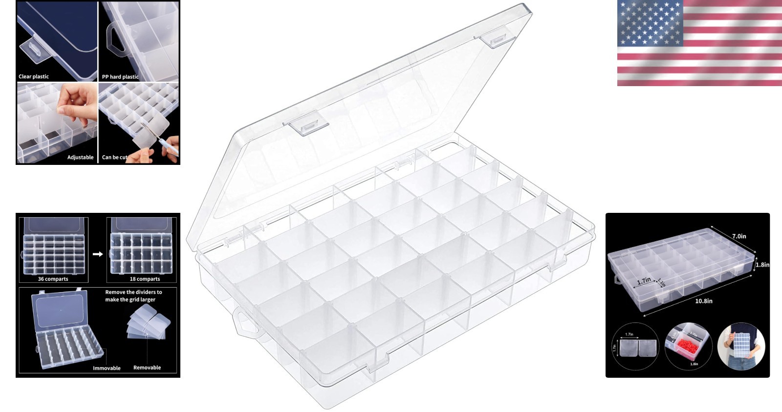 36-Grid Clear Plastic Organizer Box - Adjustable Compartments for Craft Storage