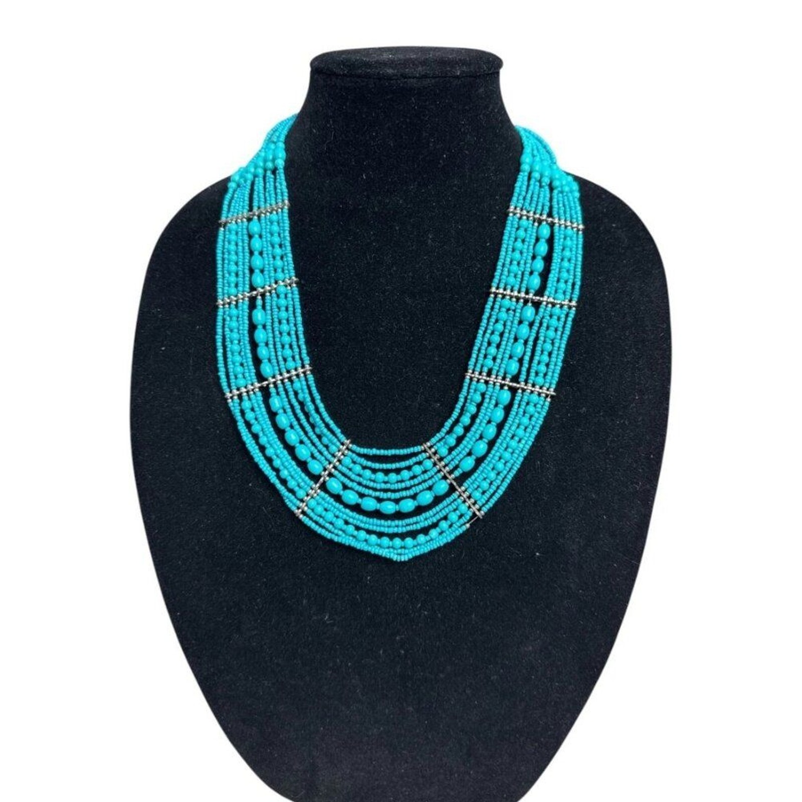 Multi-Strand Faux Turquoise Beaded Statement Necklace Silver Tone Boho Chic