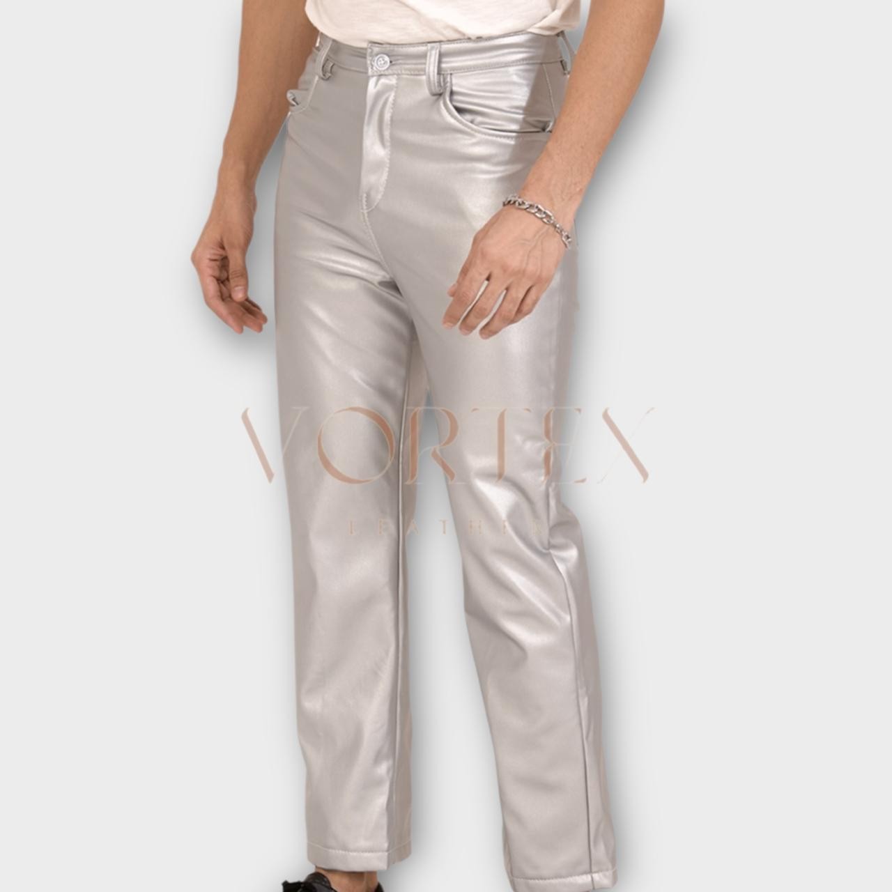 Men's Silver Causal Leather Dress Pant In Genuine Lambskin Leather Dress Pant