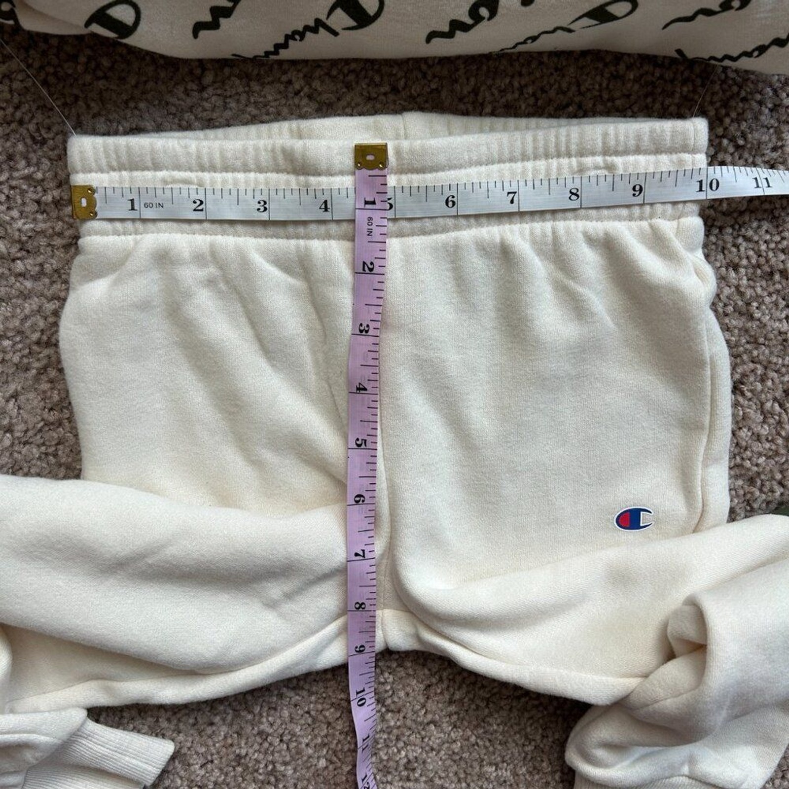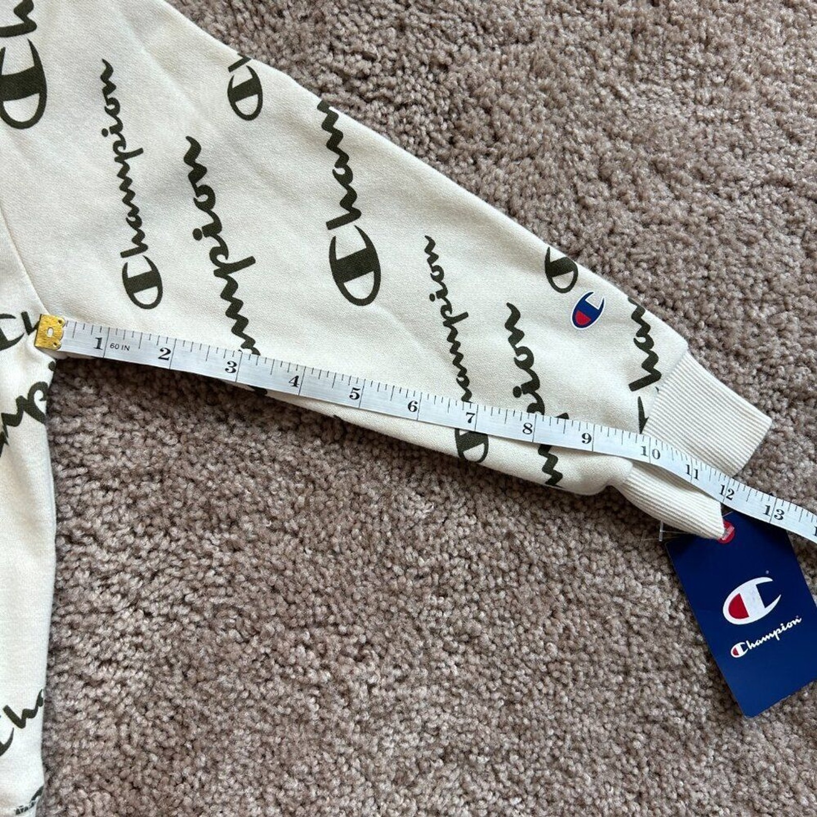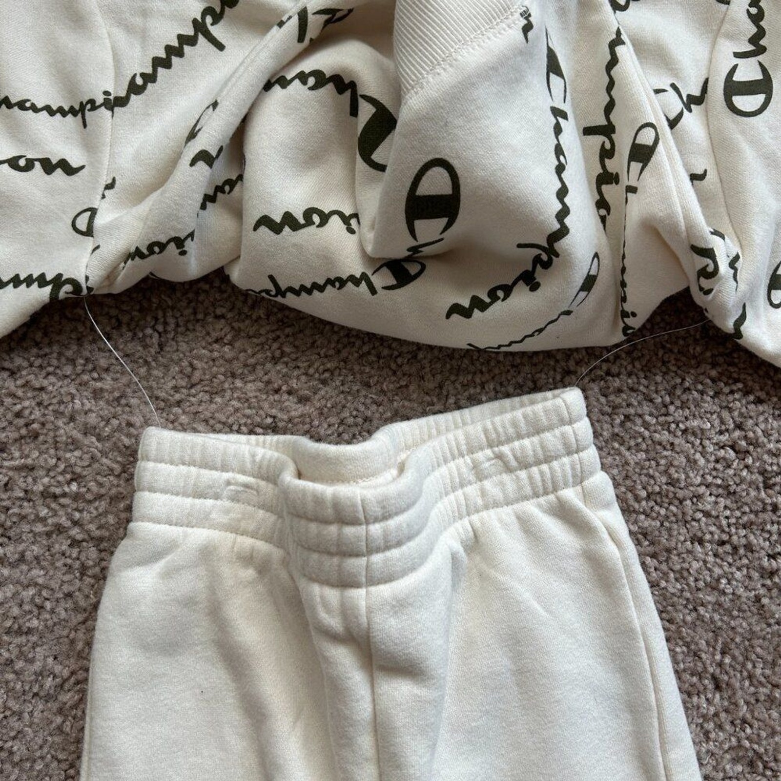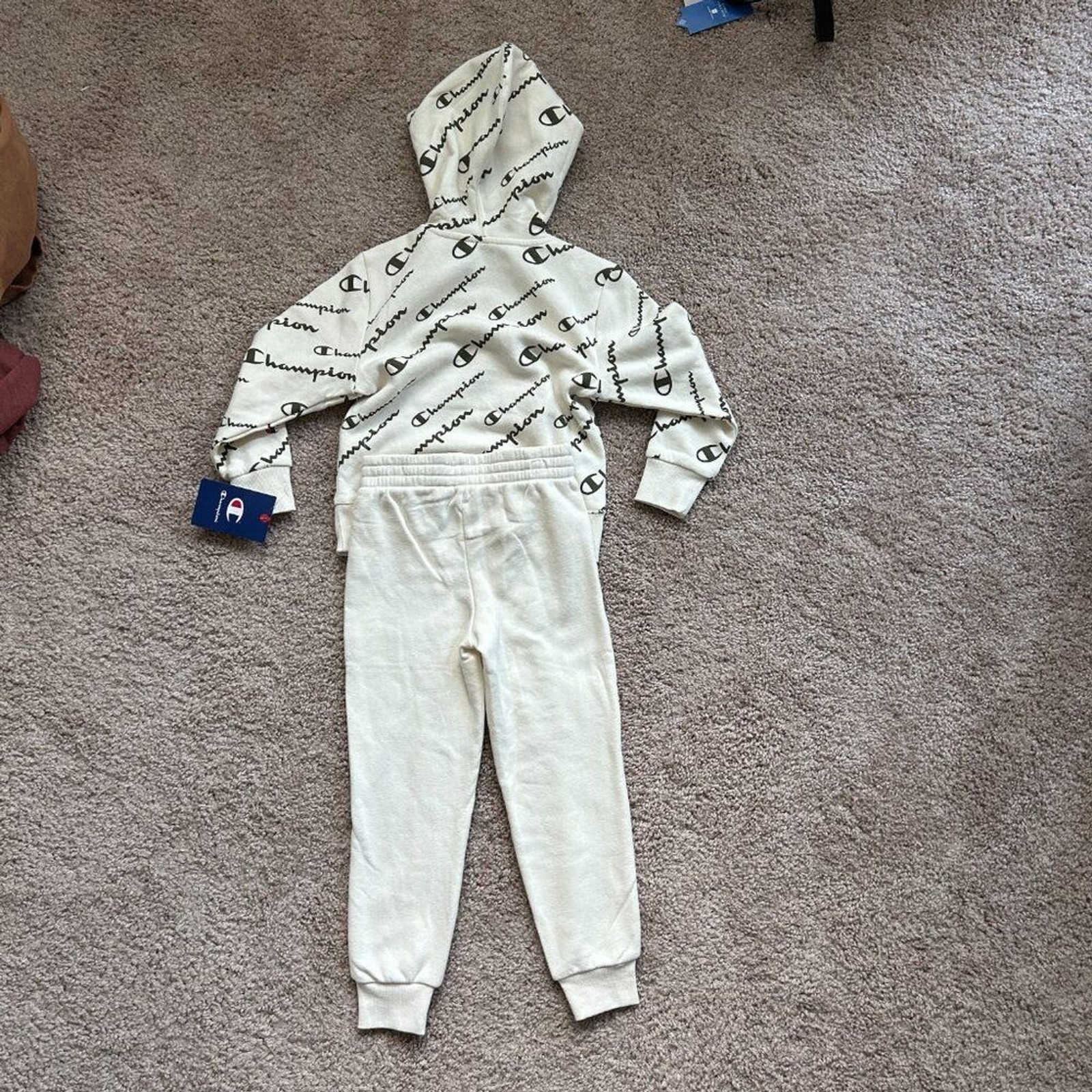 как выглядит Champion 2 Piece Hoodie Jogger Logo Print Natural White Sweat Set NWT Kids 5 фото