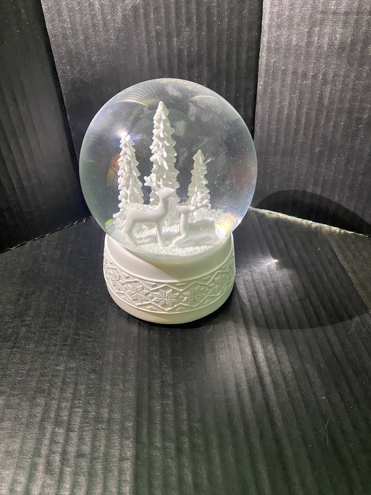 как выглядит White Antique Christmas Snow Globe with Winter Trees and Reindeer D cor фото