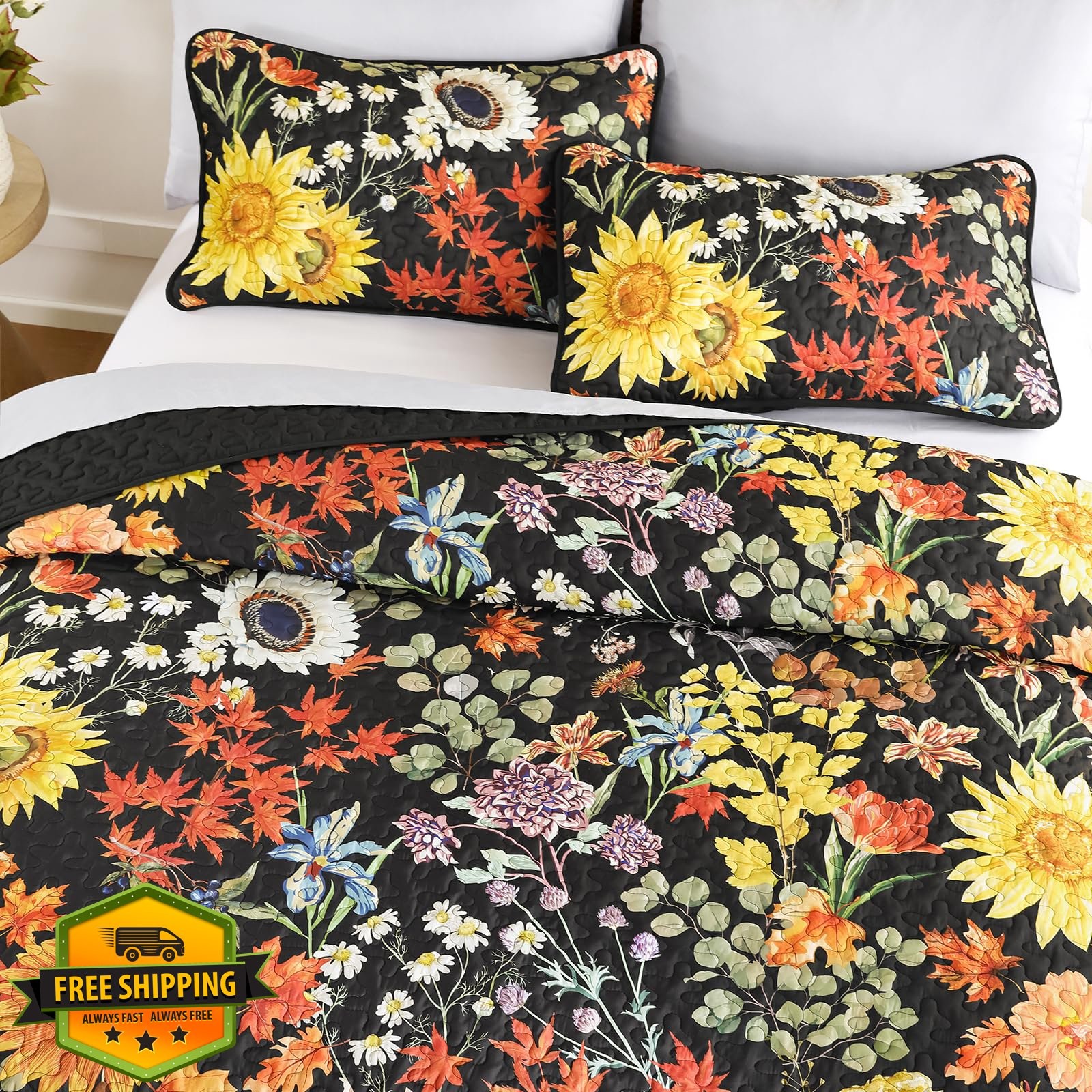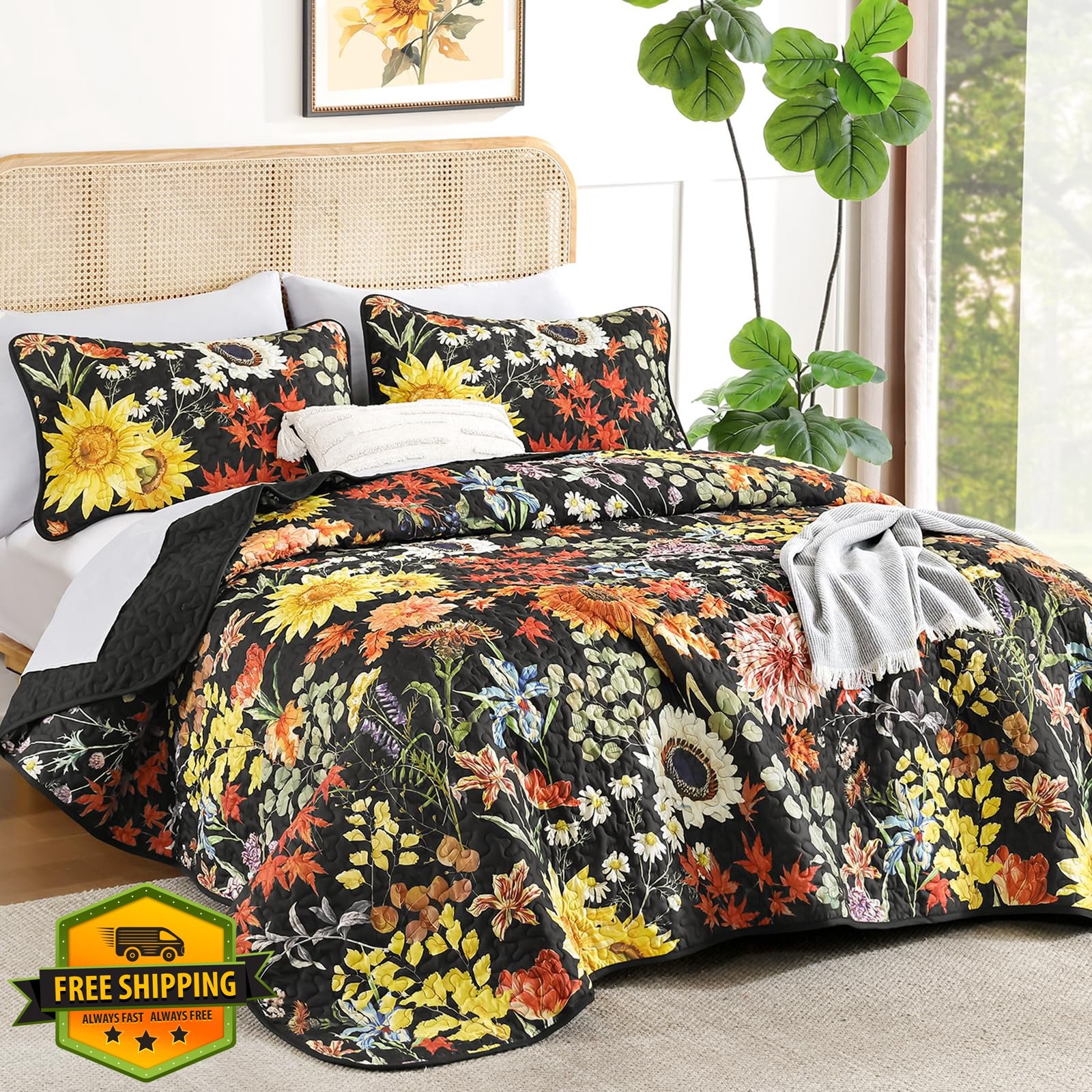 Yiran Sunflower Quilt Set King - Black Yellow 3 Pc Bedding, 106x90