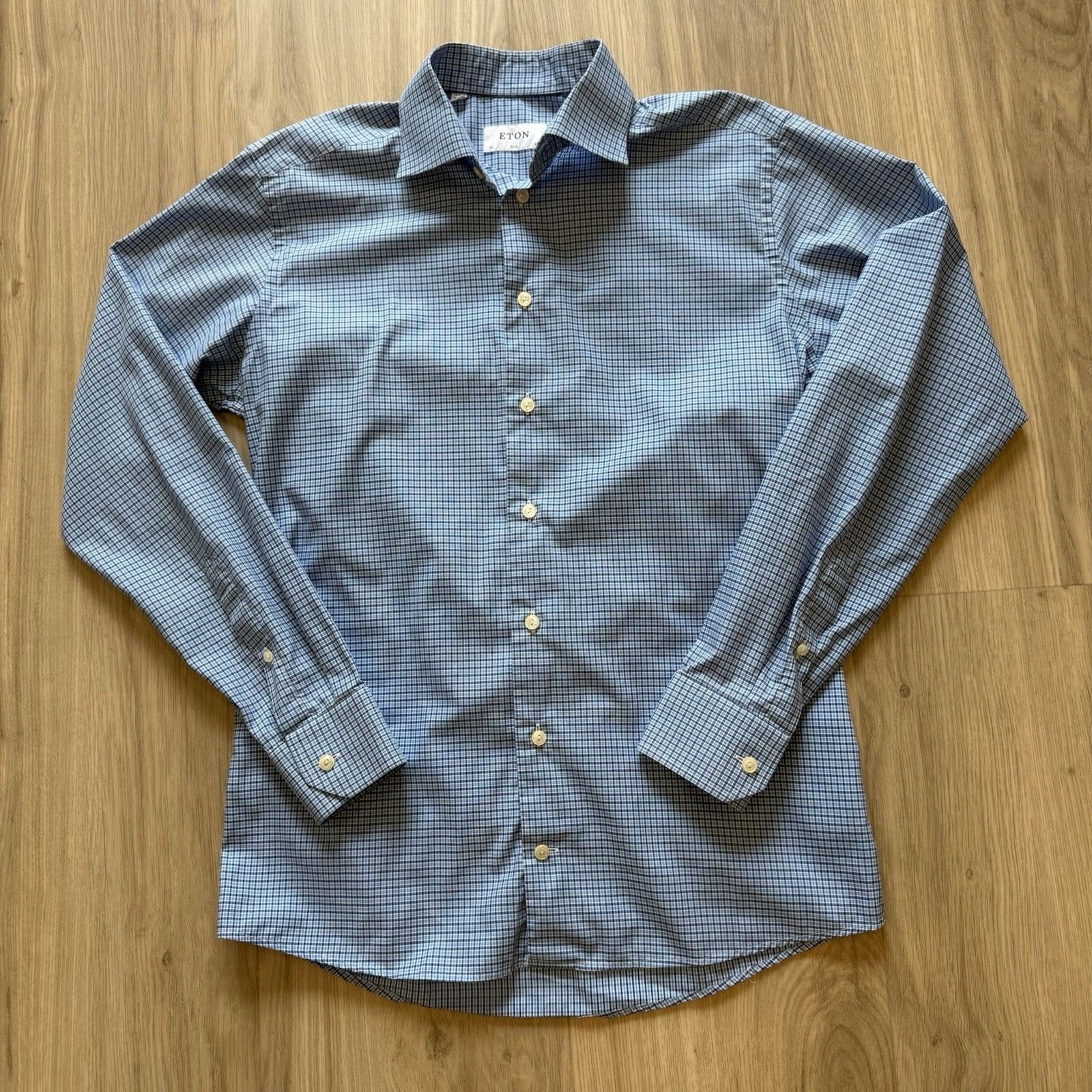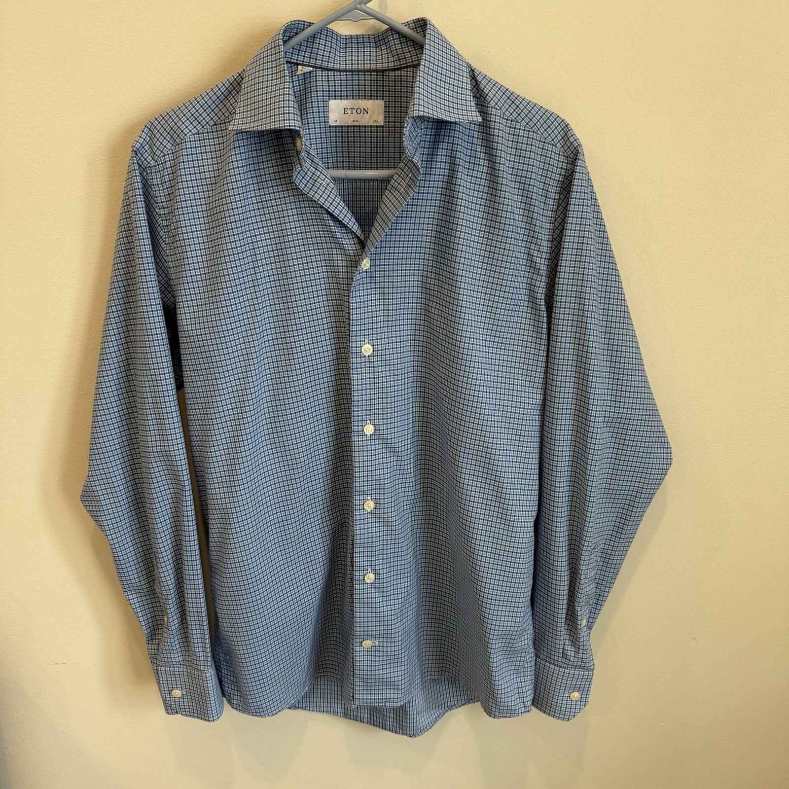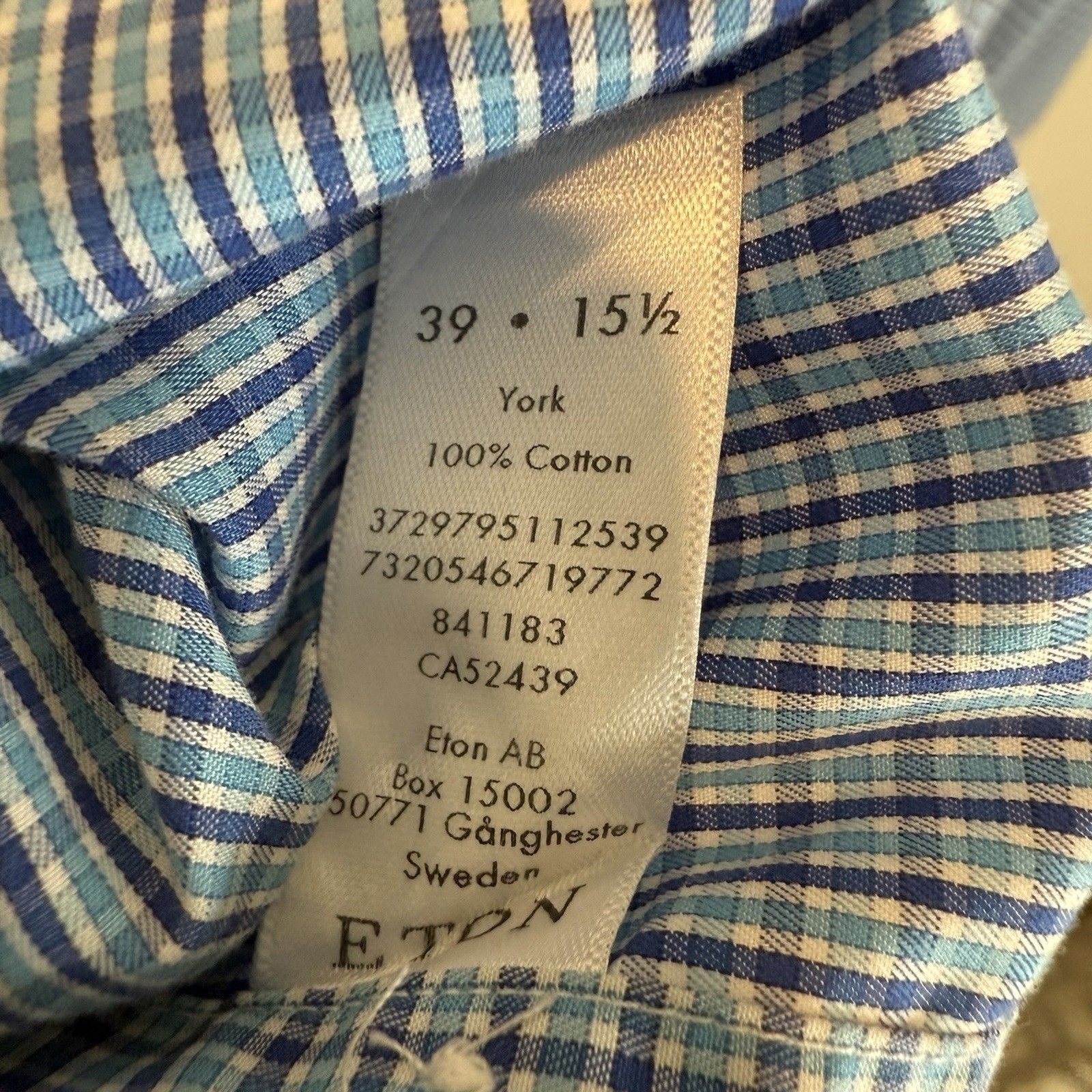 Eton 39 / 15.5 Check Signature Oxford Slim Fit Dress Shirt Blue 100 Cotton EUC