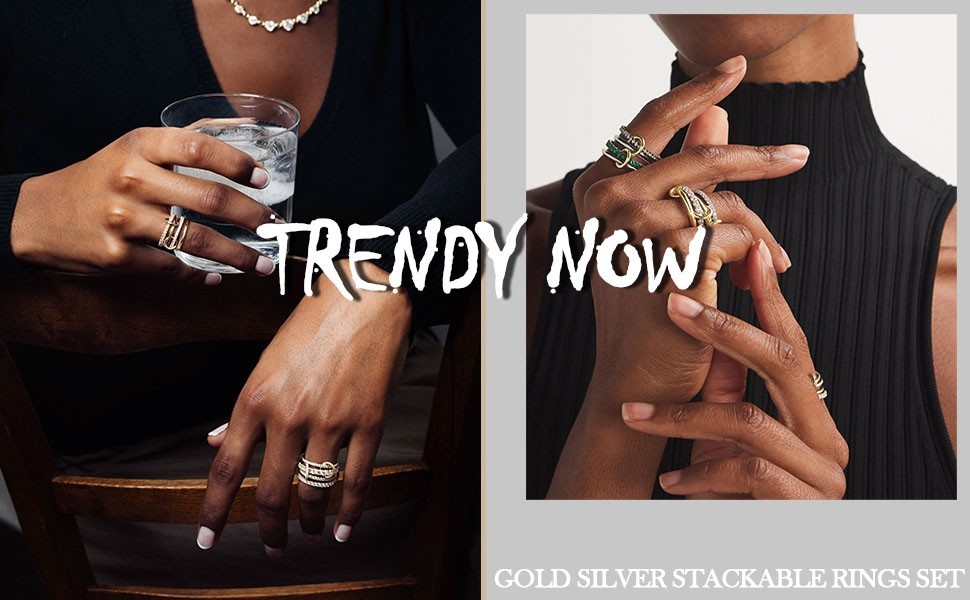 как выглядит Stackable Gold Rings Set for Women, 18K Gold Plated, CZ Interlocking Bands, Wate фото