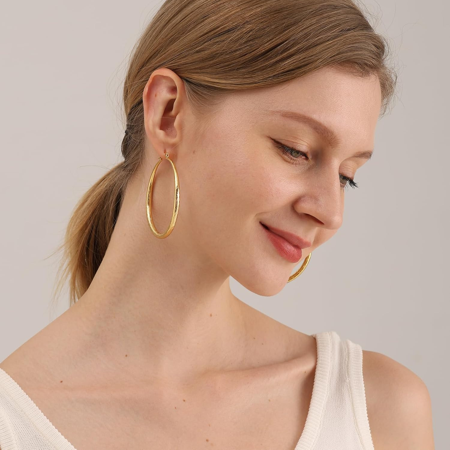 как выглядит 925 Sterling Silver 50mm Gold Diamond Cut Ripple Hoop Earrings фото