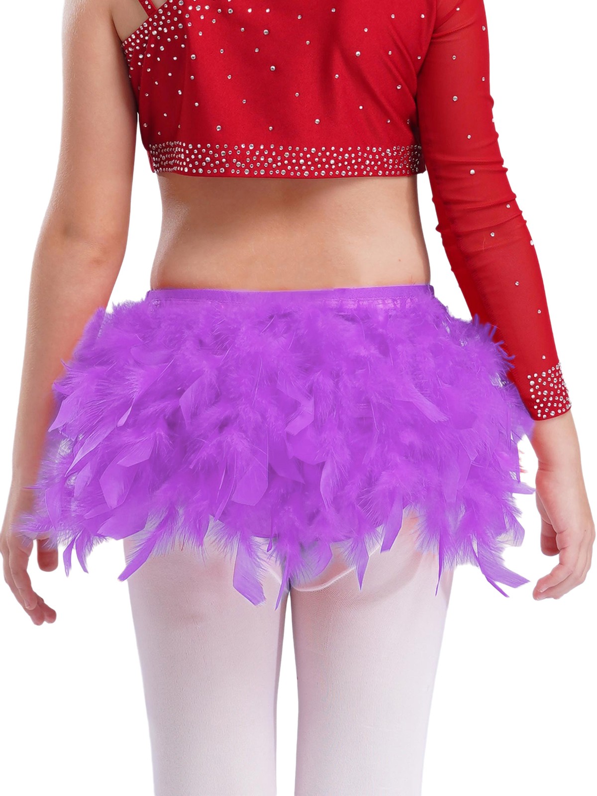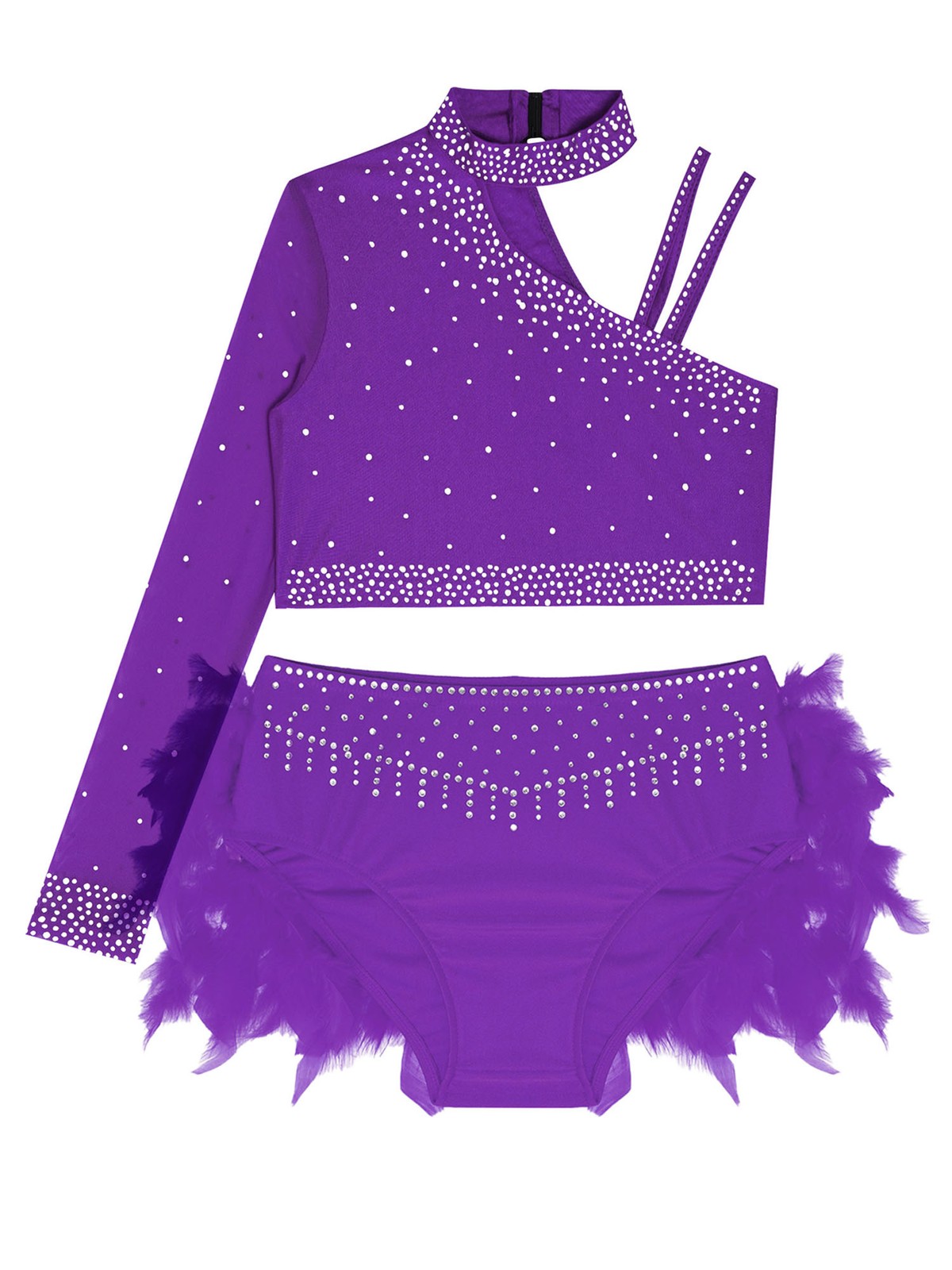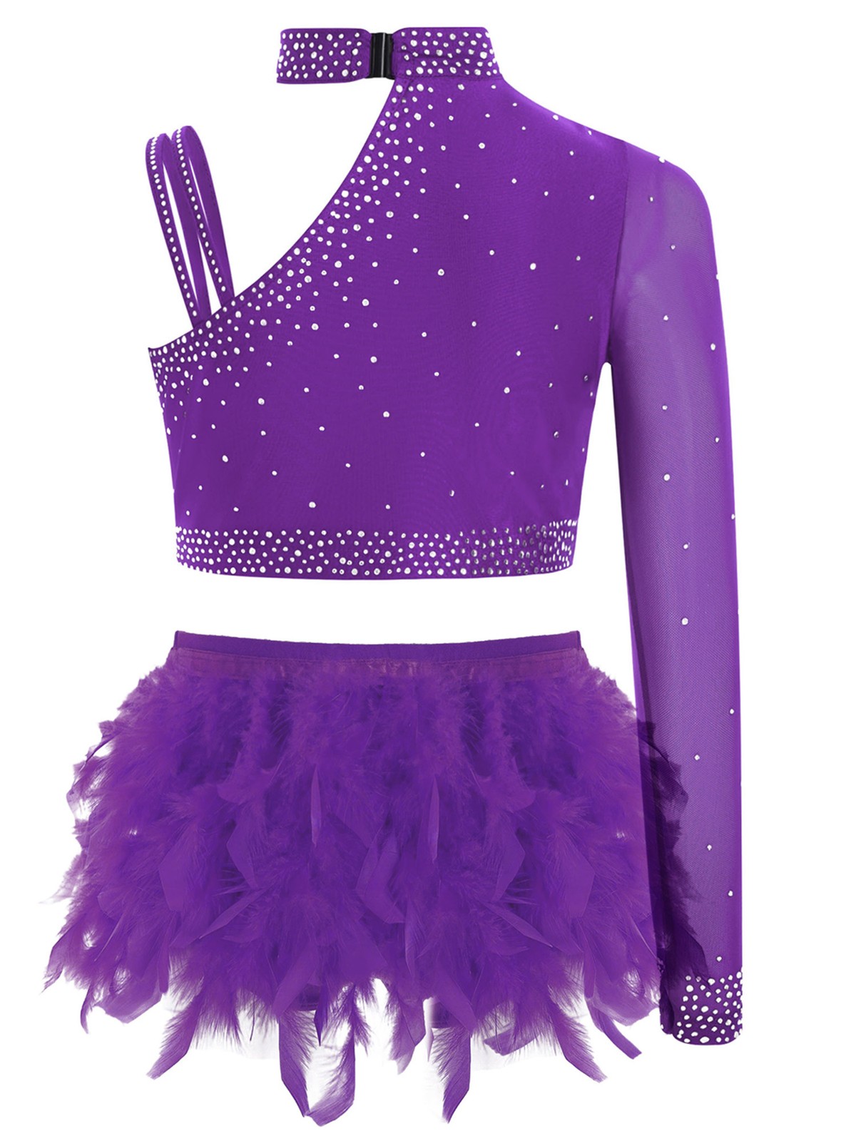 Girl Jazz Latin Dance Glittery One Shoulder Crop Top and Feather Skirt Dancewear