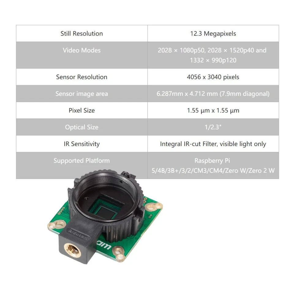 Arducam for Raspberry Pi HQ Camera Module,12.3MP camera No lens, Black