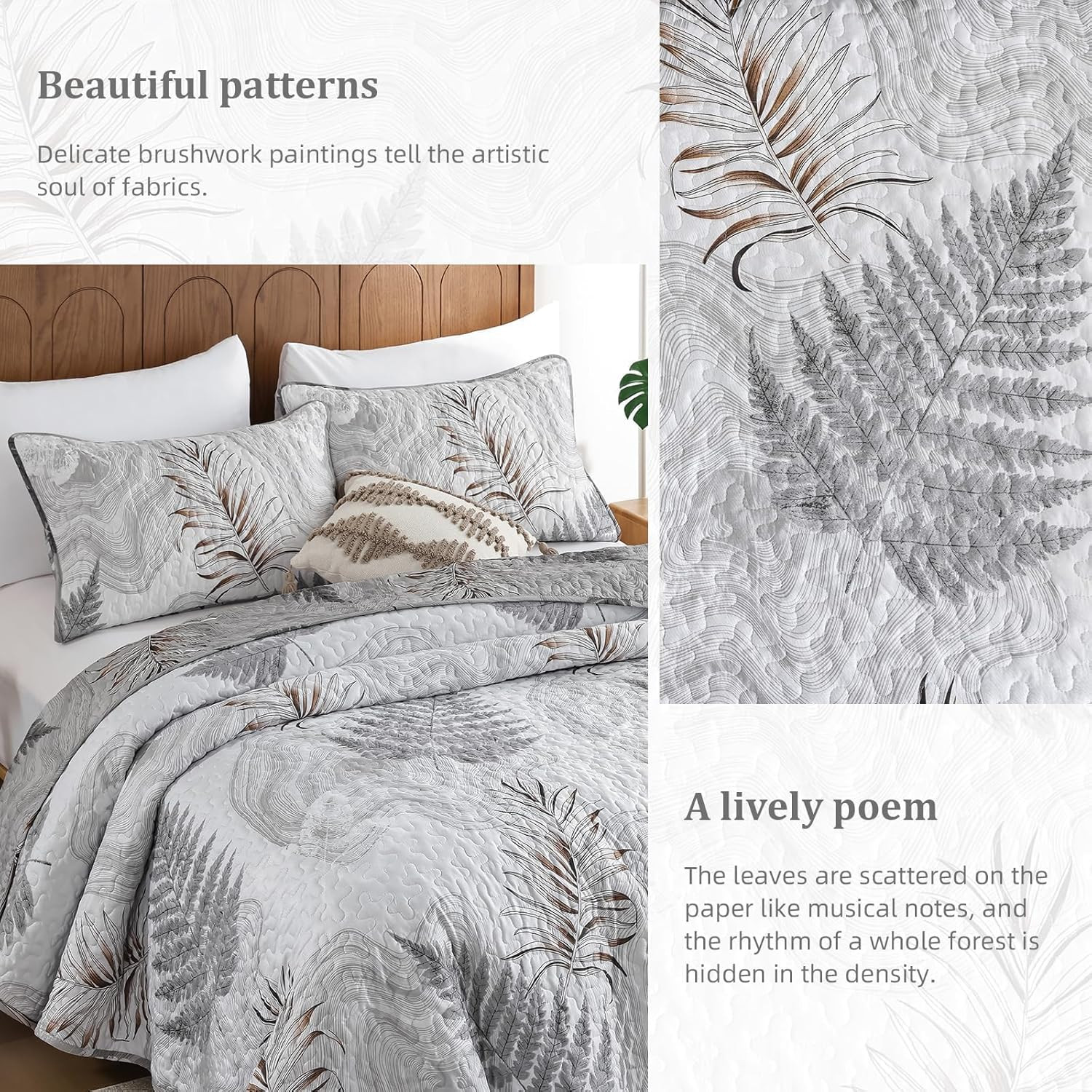 Quilts Set Queen Size, Grey Queen Quilt Bedspread Bedding Set Floral Leaf Patter