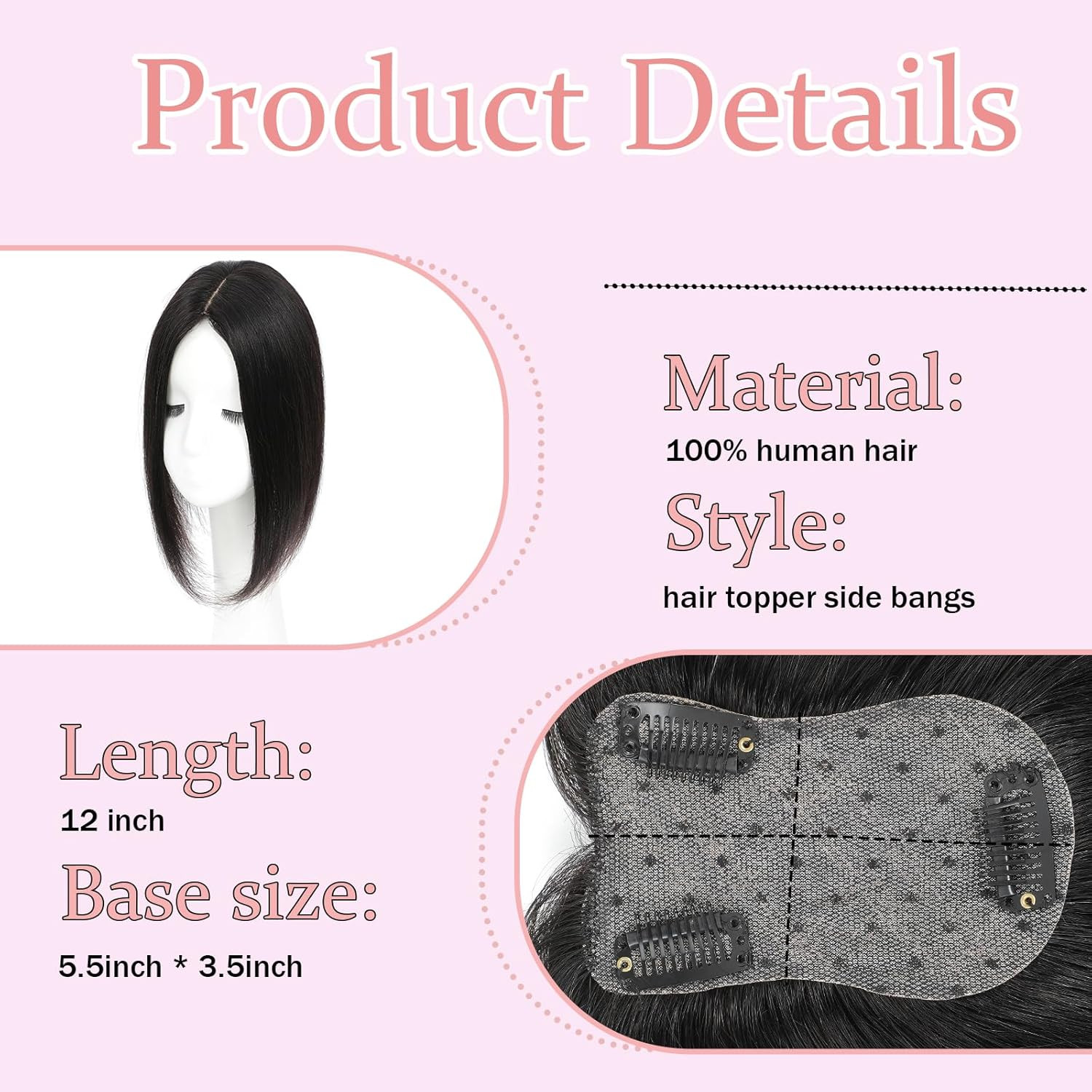 Real Human Hair Toppers for Women, 360 Clip-in Bangs with Scalp Line Black