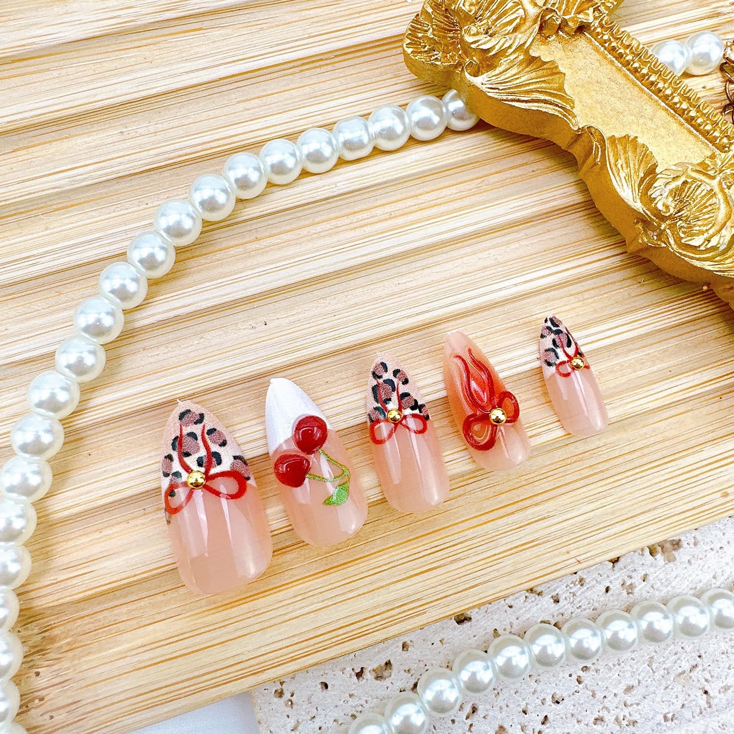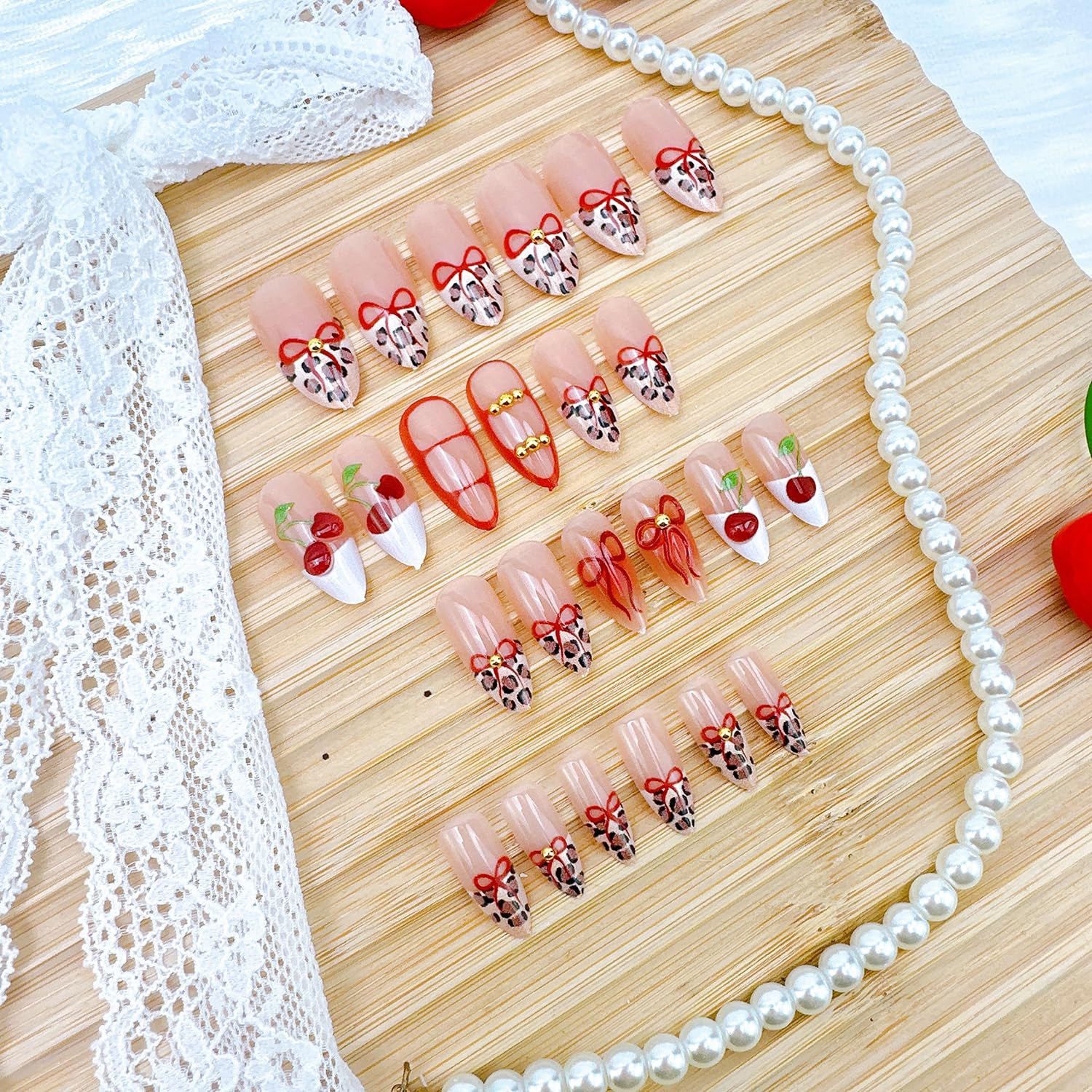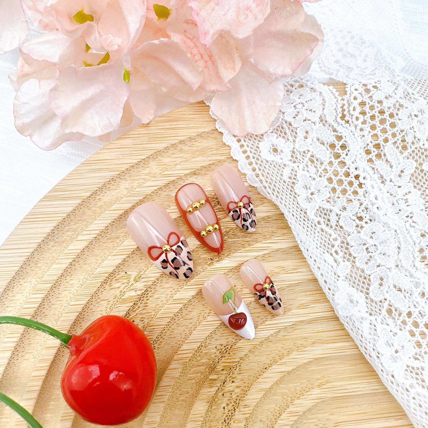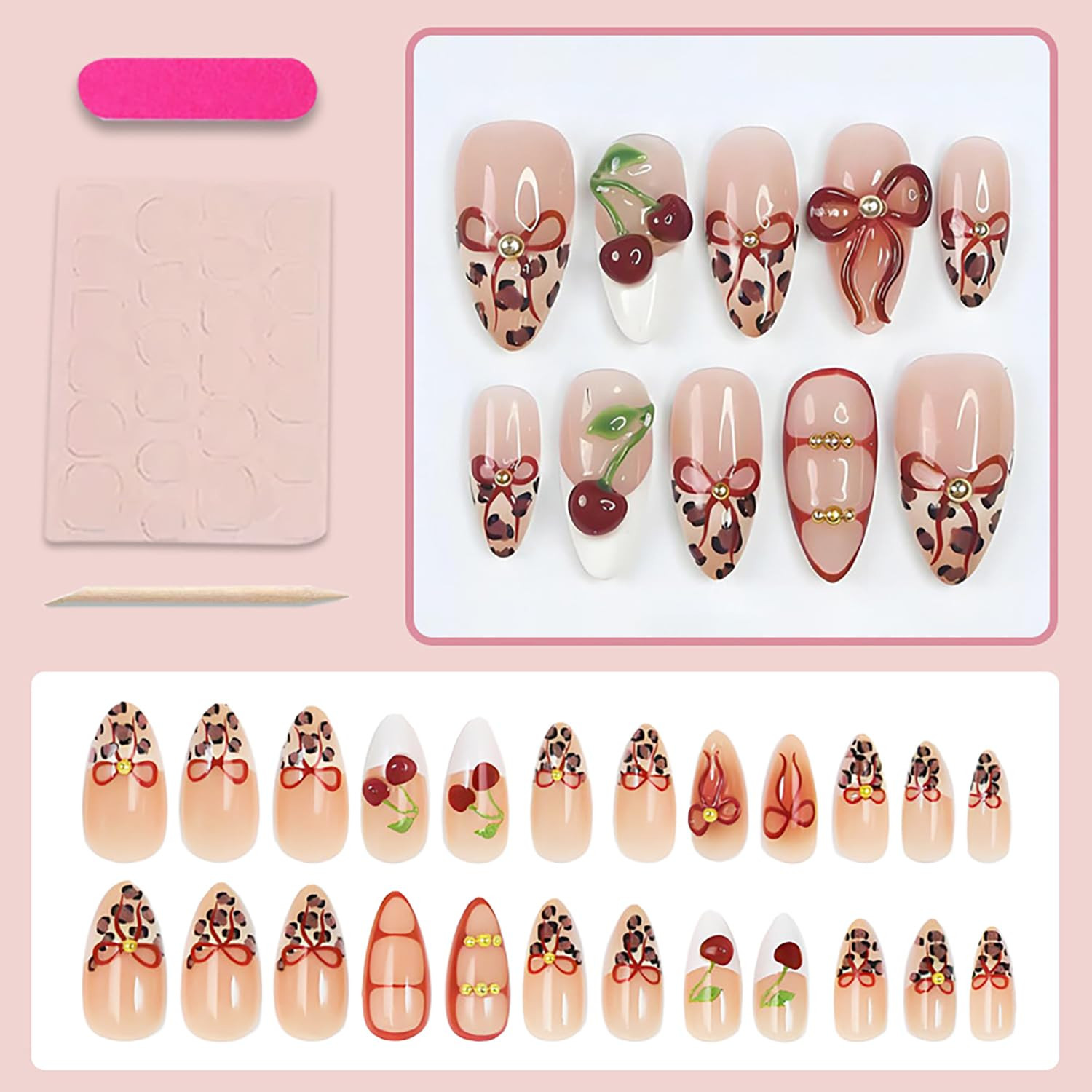 как выглядит Leopard Print French Tip Press-On Nails with 3D Cherry Bow Designs, 24 Pcs фото