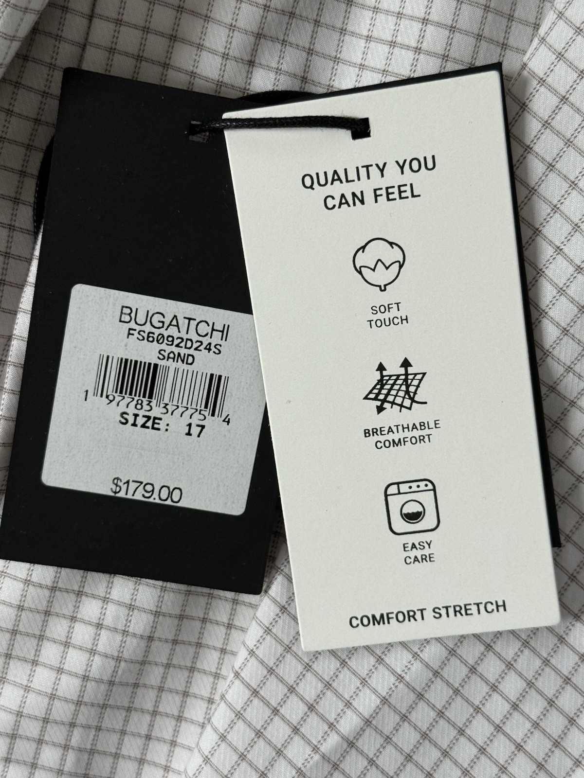 Bugatchi Men s NWT Comfort Stretch Button Down Check Shirt Sand Size 17 34/35