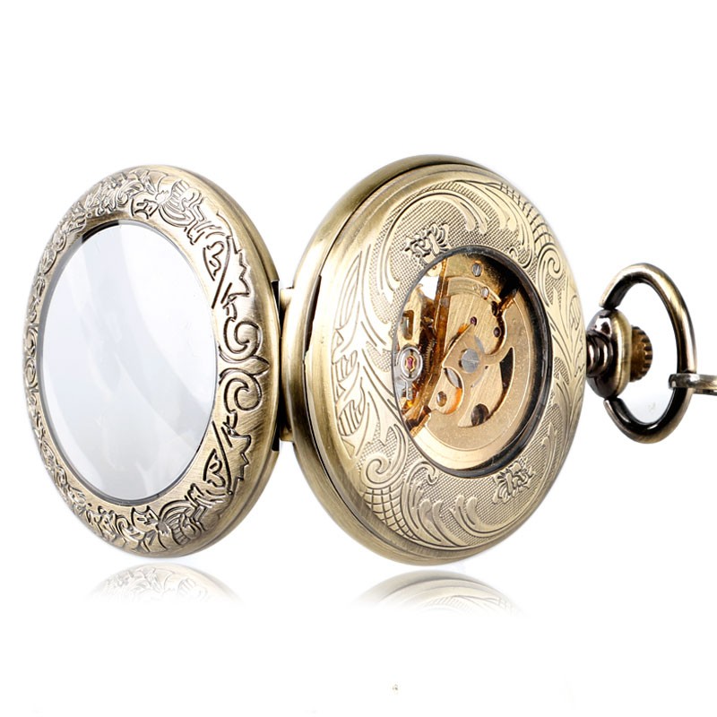 Vintage Bronze Pocket Watch Engraved Automatic Roman Skeleton Exhibition Back