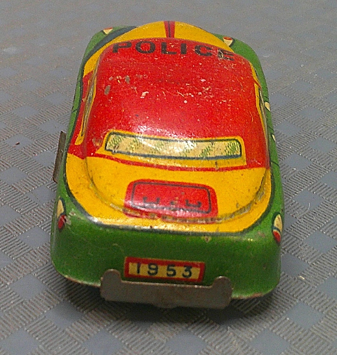 Vintage 1953 Tin Litho Friction Police Squad Car Vehicle Red Green Yellow Japan