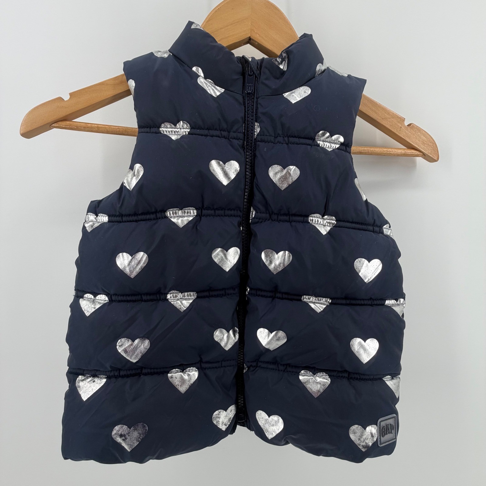 Baby Gap Girls Navy Blue Silver Heart Puffer Vest 5T Toddler Full Zip Quilted