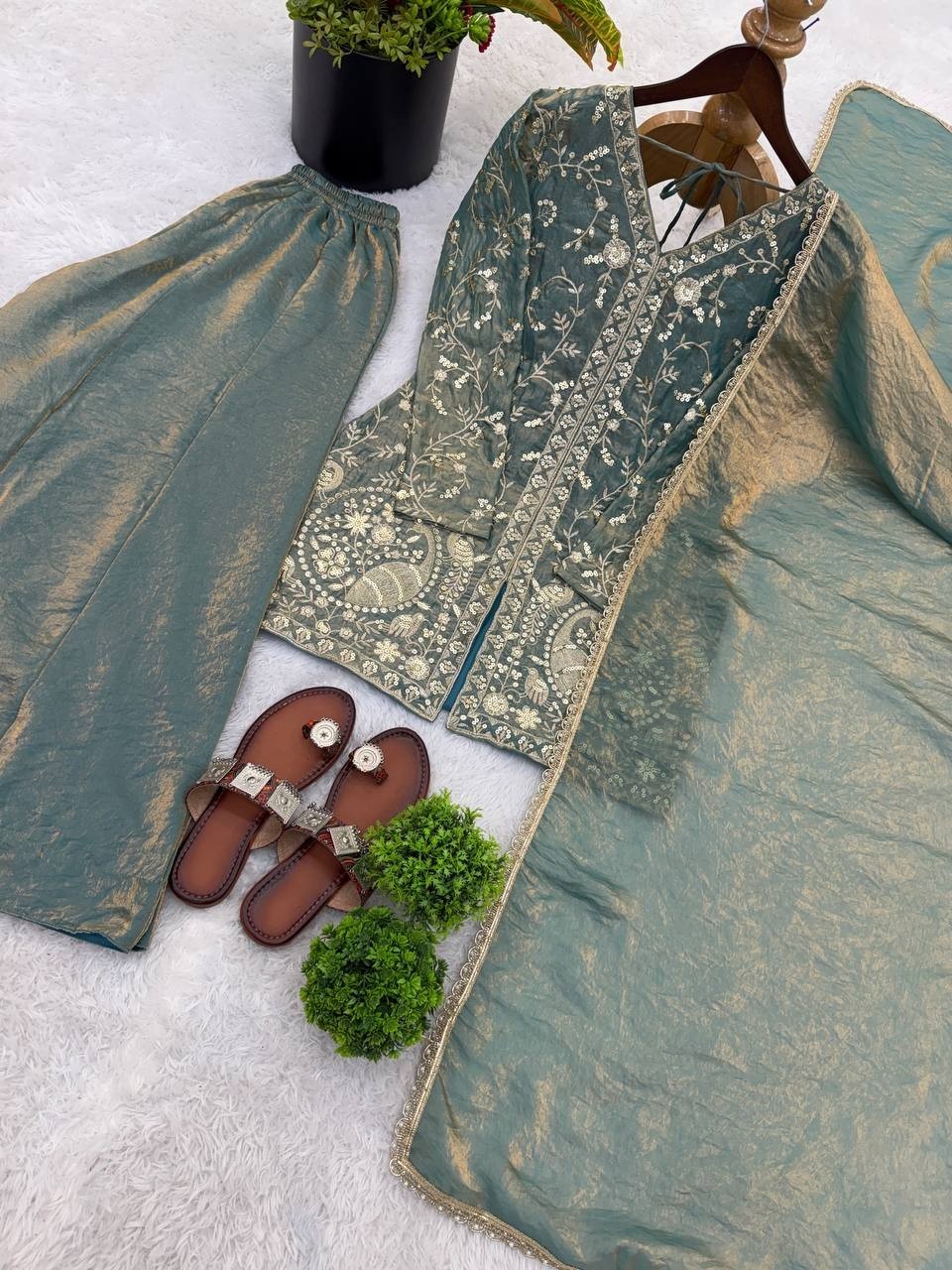 как выглядит Beautiful Silk Sea Green Top Palazzo With Dupatta For Reception Wear фото