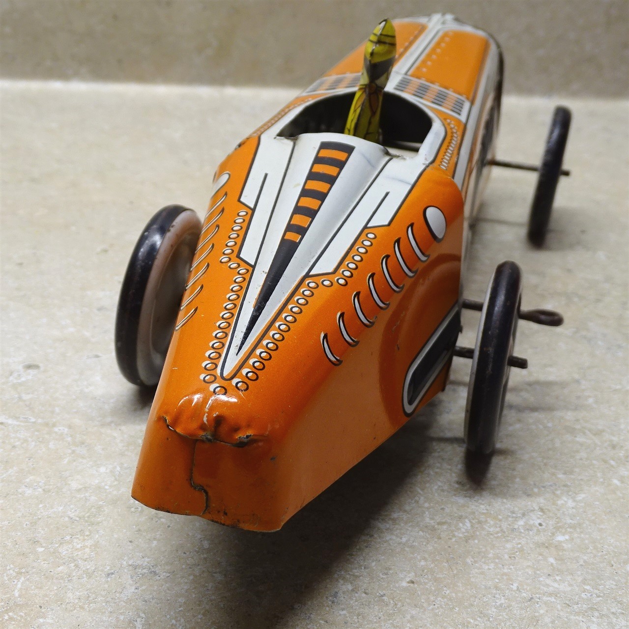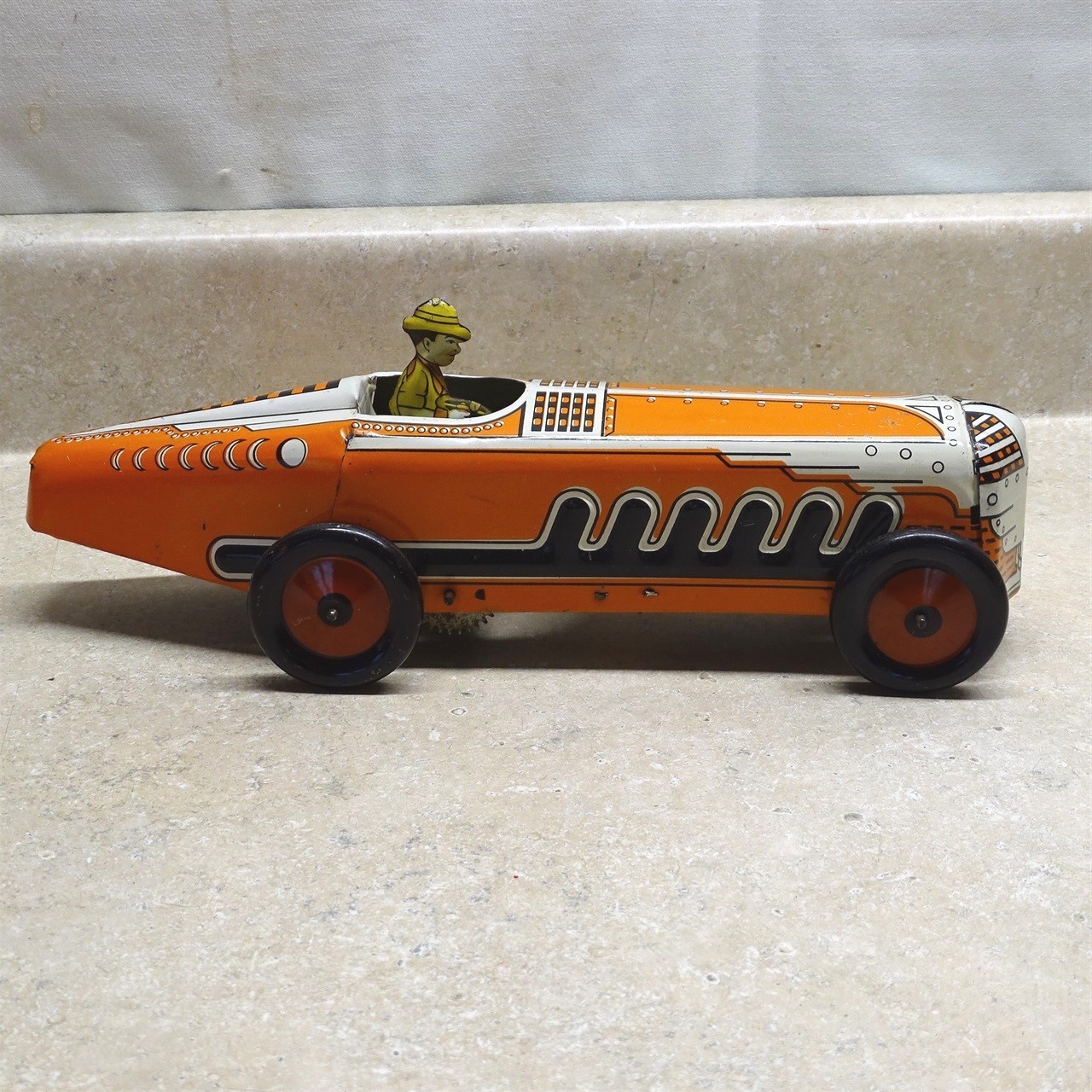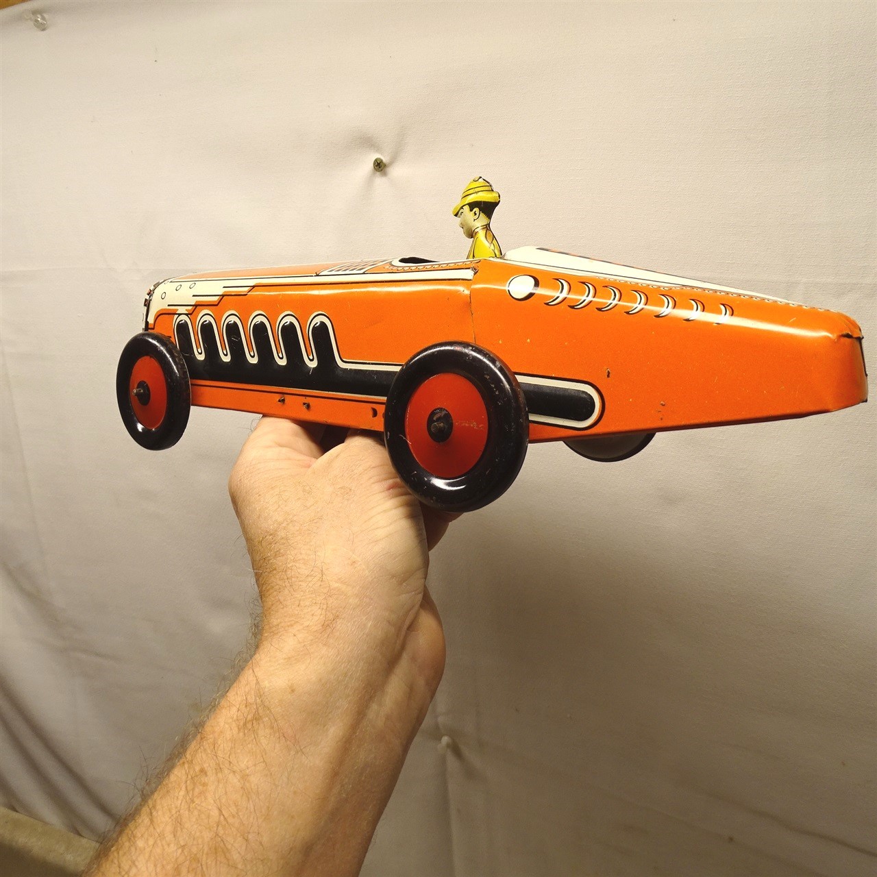 как выглядит Vintage Marx Toys Tin Wind-Up Car, Open Wheel With Driver, 13" фото