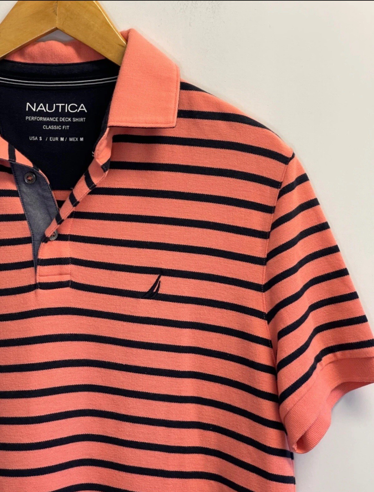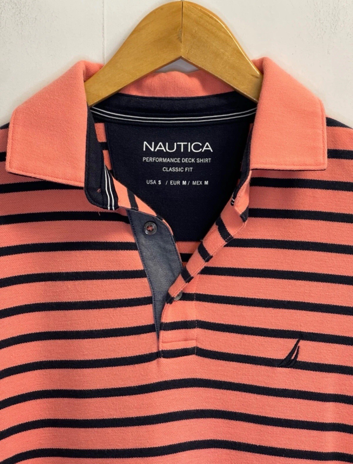 Nautica Men's S Performance Deck Shirt Short Sleeve Polo Peach Striped Logo