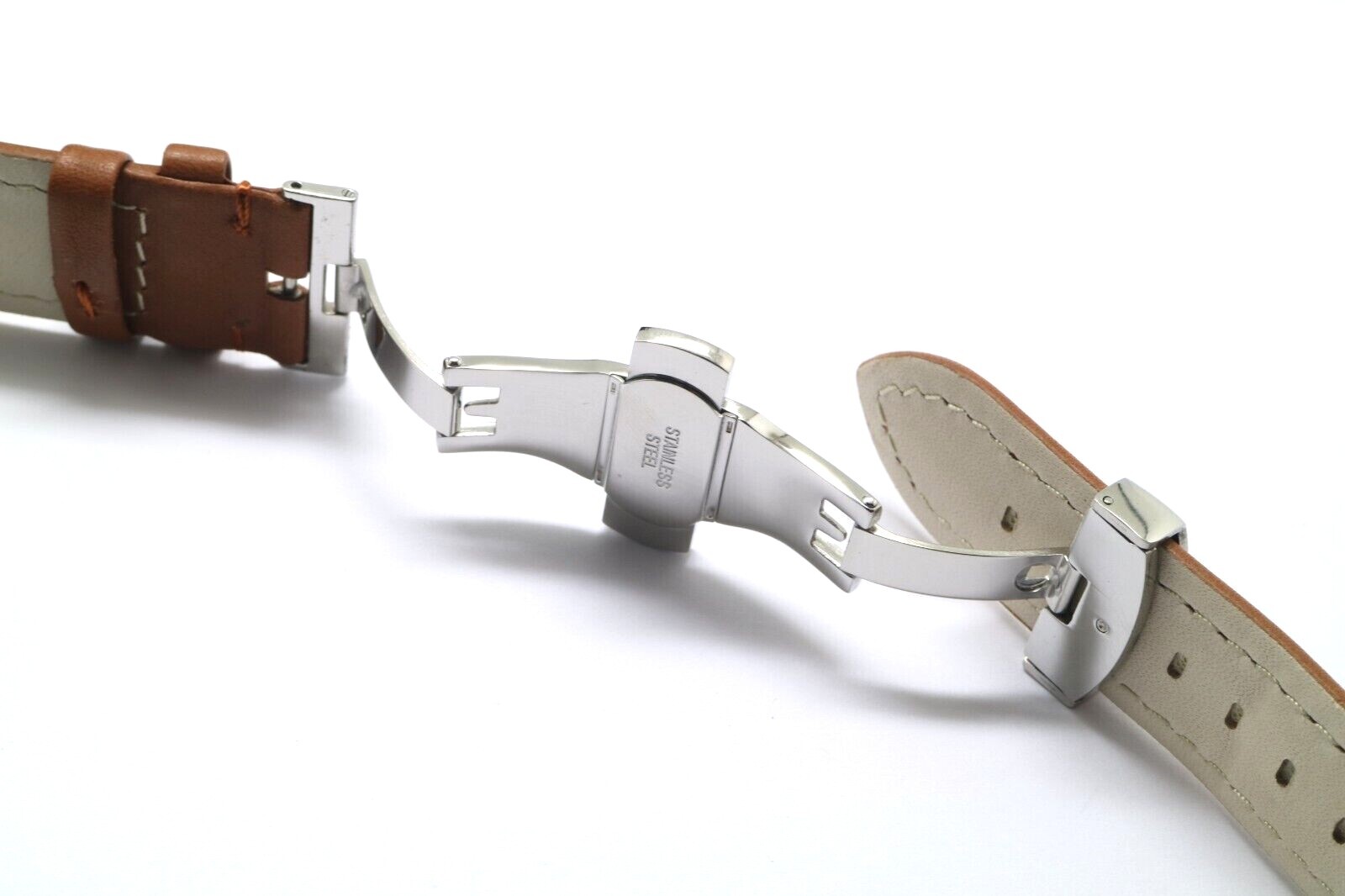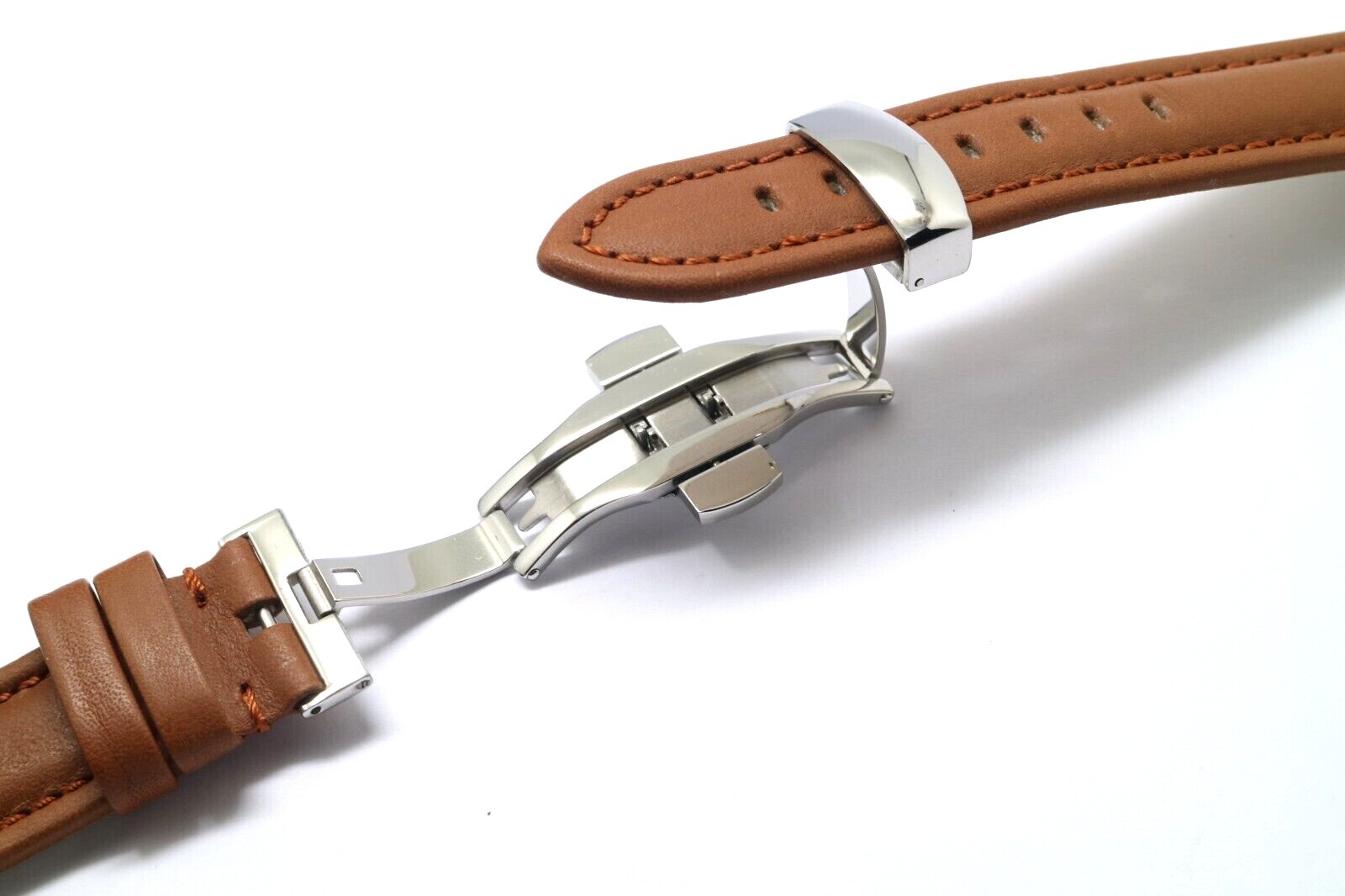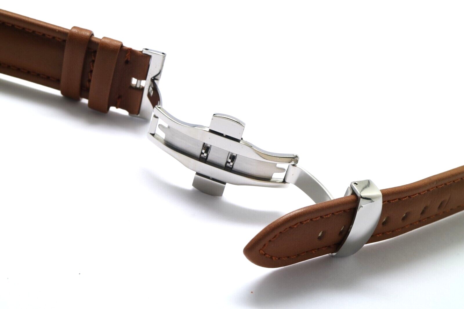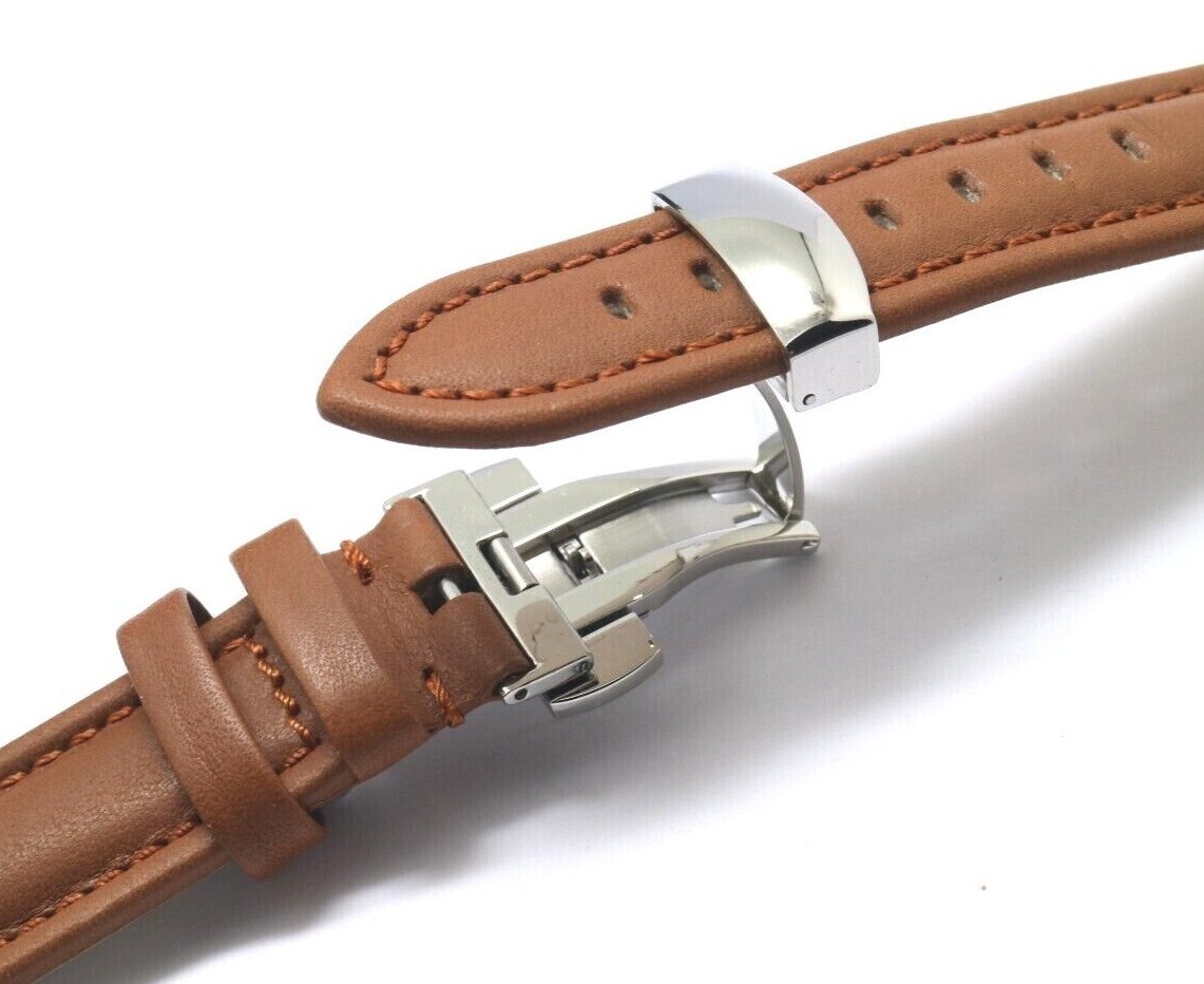 20 22 24mm Brown Genuine Leather Watch Strap Silver Push Button Deployant Clasp