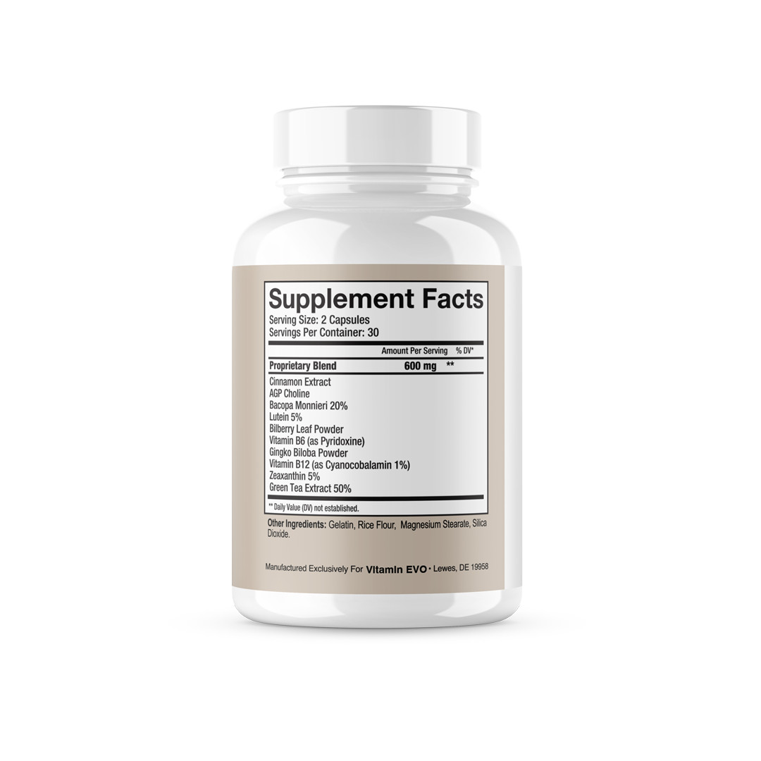 Ingredients: Brahmi (Bacopa monnieri), Lutein, Vitamin B12, Vitamin B6, Zeaxanthin, Cinnamon Extract, AGP Choline, Bilberry Leaf Powder, Gingko Biloba, Green Tea Extract