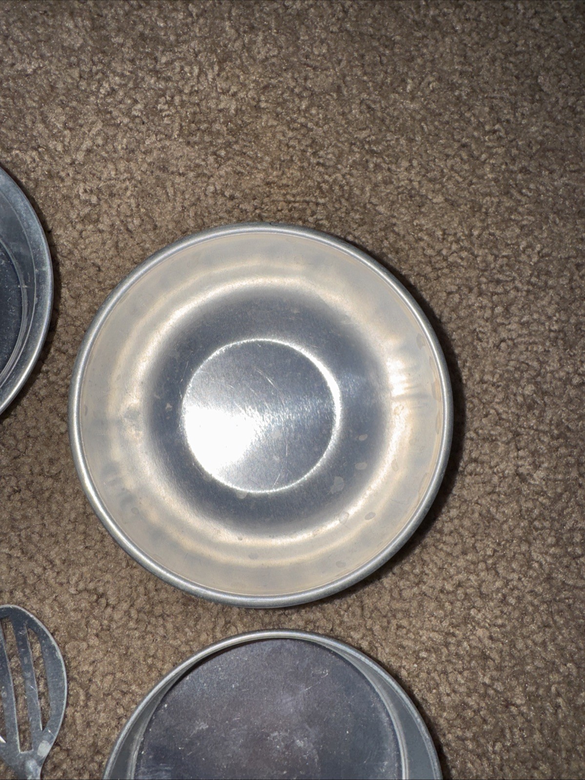 как выглядит Vtg. Children s Aluminum Pans Utensils Tins 9 Piece фото