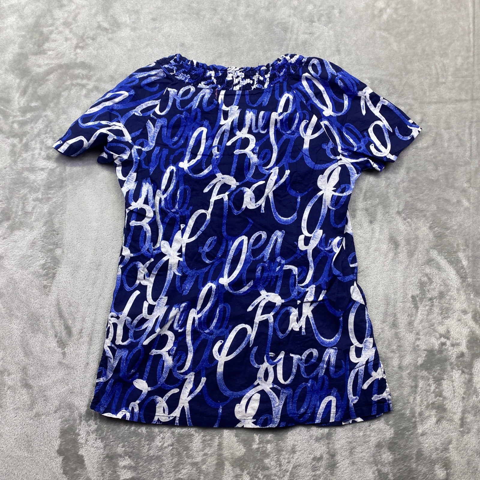Koi by Kathy Peterson Blue White Script Print Ruffle Neck Scrub Top XS Boho